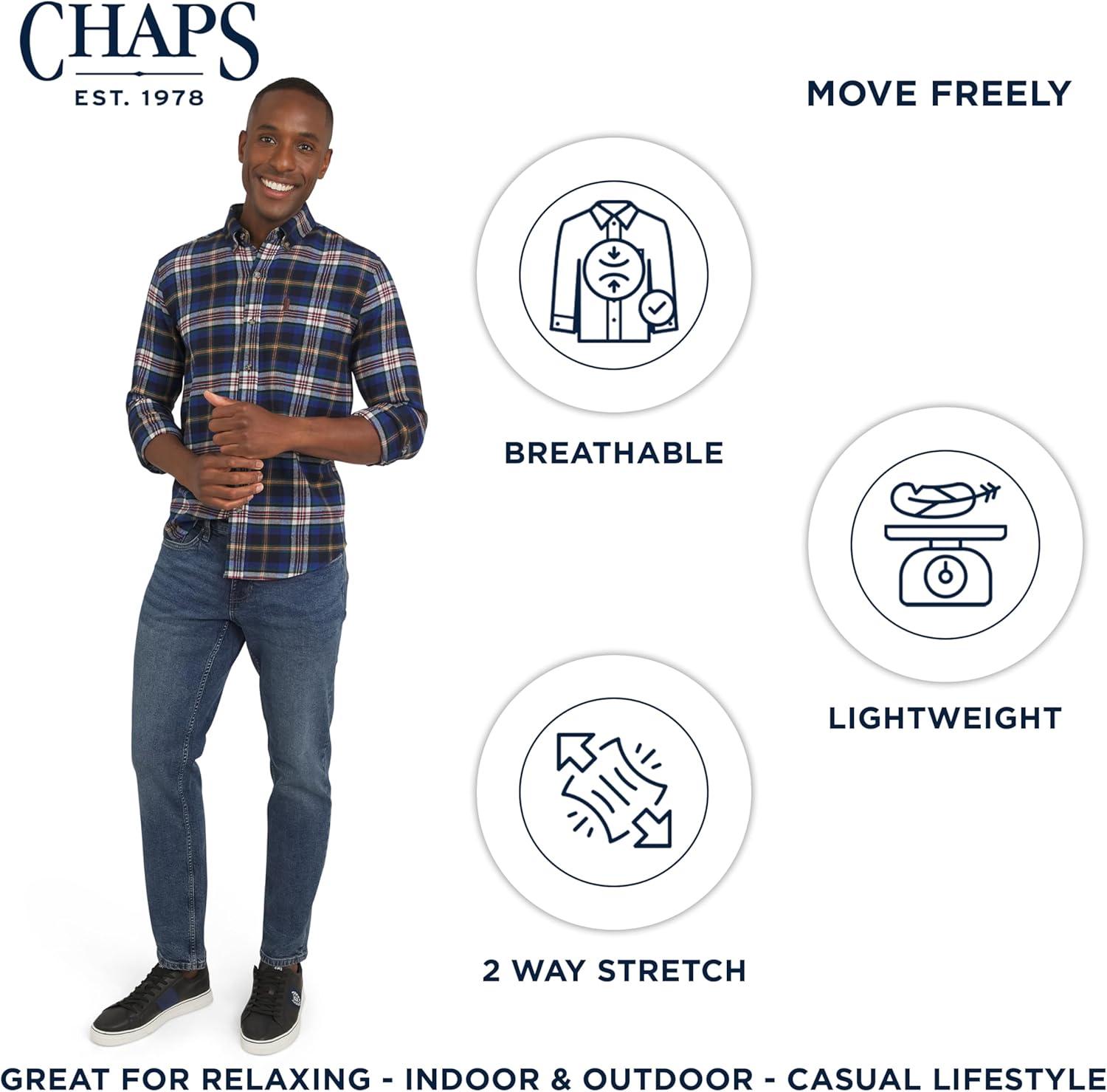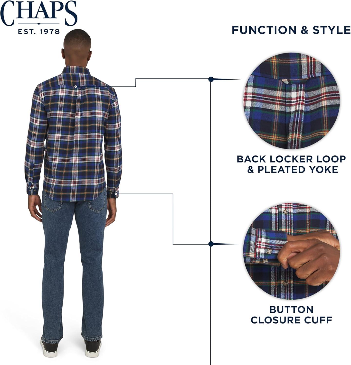 A true wardrobe classic, this Chaps flannel shirt embodies the brand's timeless American aesthetic that began in 1978. Designed for both comfort and versatility, it has a plush look and feel that easily transitions from a relaxed weekend at home to a casual get-together with friends. With a range of sharp designs and vibrant colors, you can effortlessly elevate your style. Pair it with jeans or chinos for a classic look, or wear it open over a t-shirt for a more relaxed, layered feel. Experience the superior comfort of our super-soft, woven, yarn-dyed twill flannel. This premium blend of cotton, polyester, and spandex provides a perfect balance of softness, breathability, and two-way stretch for ultimate freedom of movement. Its rich colors and intricate patterns are designed for lasting quality, ensuring they won't fade even after countless washes. This shirt not only looks great but is also machine washable for convenient, low-maintenance care. This long-sleeve shirt is designed with a classic fit and thoughtful details that stand the test of time. It features a sophisticated button-down collar, a convenient chest pocket with a signature Chaps leather patch logo, and a back pleated yoke with a locker loop. The scooped hem allows you to wear it tucked in or untucked for different looks, while the button closures on the cuffs add a polished finish. Available in a wide range of sizes, this flannel is a versatile and durable addition to any wardrobe.