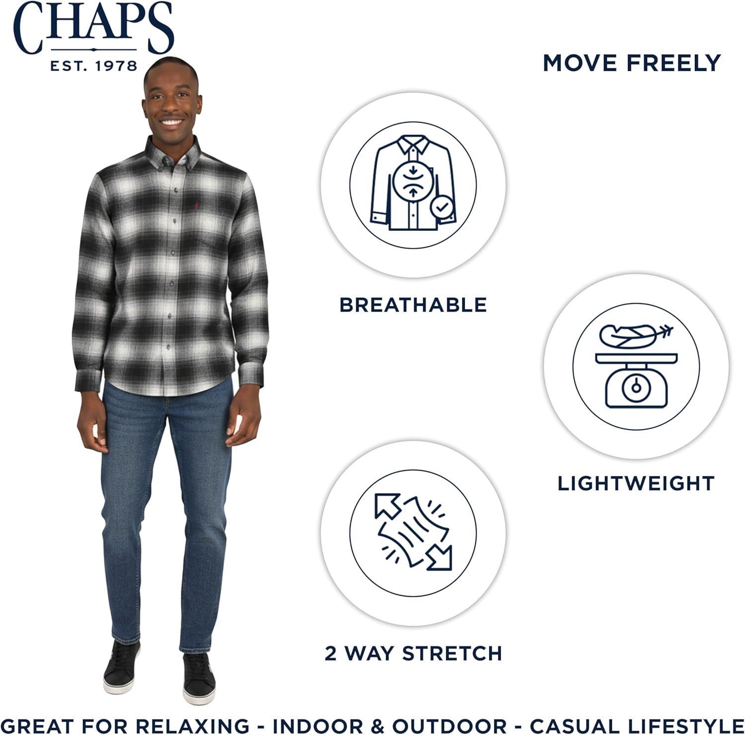 A true wardrobe classic, this Chaps flannel shirt embodies the brand's timeless American aesthetic that began in 1978. Designed for both comfort and versatility, it has a plush look and feel that easily transitions from a relaxed weekend at home to a casual get-together with friends. With a range of sharp designs and vibrant colors, you can effortlessly elevate your style. Pair it with jeans or chinos for a classic look, or wear it open over a t-shirt for a more relaxed, layered feel. Experience the superior comfort of our super-soft, woven, yarn-dyed twill flannel. This premium blend of cotton, polyester, and spandex provides a perfect balance of softness, breathability, and two-way stretch for ultimate freedom of movement. Its rich colors and intricate patterns are designed for lasting quality, ensuring they won't fade even after countless washes. This shirt not only looks great but is also machine washable for convenient, low-maintenance care. This long-sleeve shirt is designed with a classic fit and thoughtful details that stand the test of time. It features a sophisticated button-down collar, a convenient chest pocket with a signature Chaps leather patch logo, and a back pleated yoke with a locker loop. The scooped hem allows you to wear it tucked in or untucked for different looks, while the button closures on the cuffs add a polished finish. Available in a wide range of sizes, this flannel is a versatile and durable addition to any wardrobe.