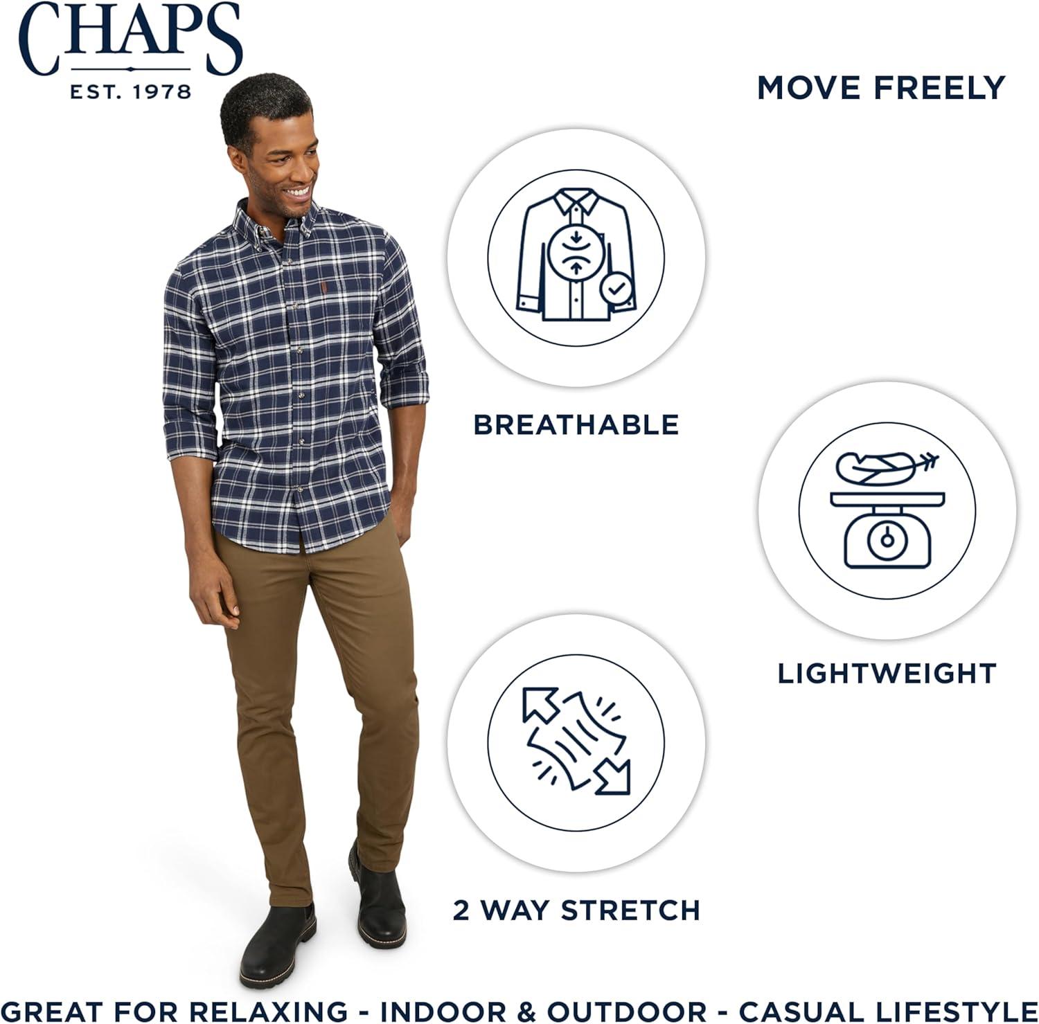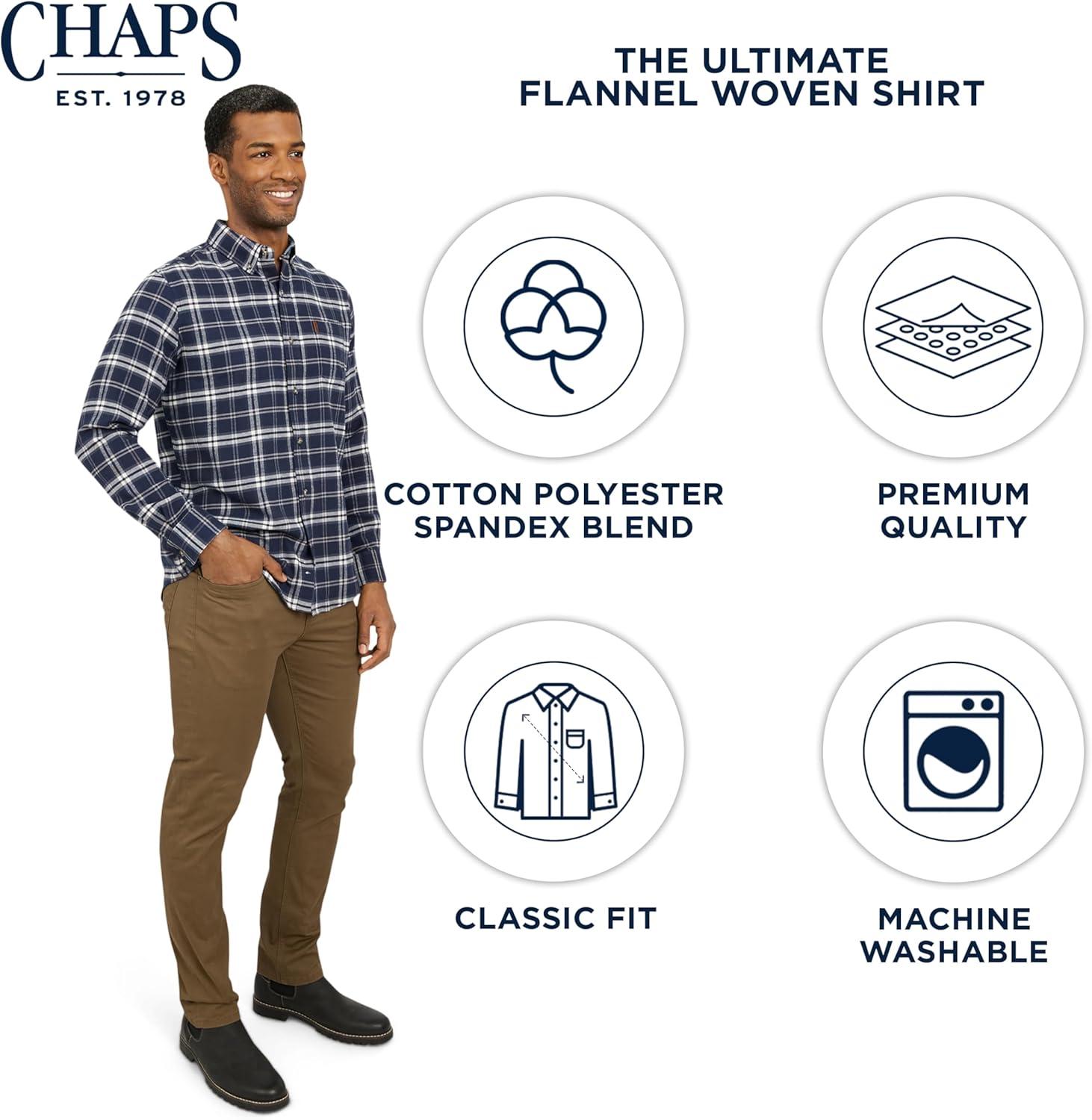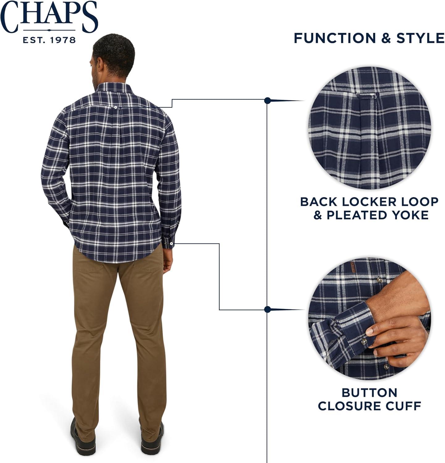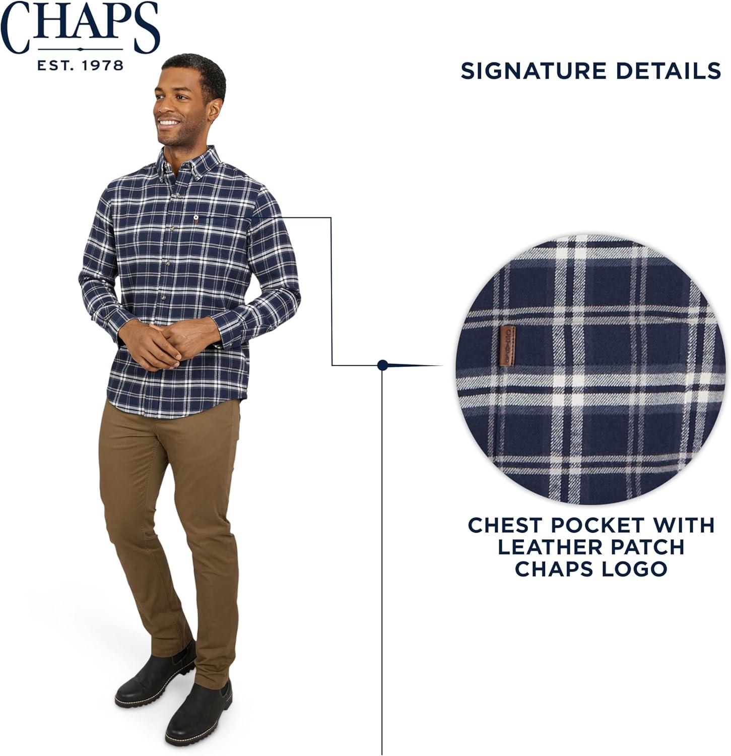 A true wardrobe classic, this Chaps flannel shirt embodies the brand's timeless American aesthetic that began in 1978. Designed for both comfort and versatility, it has a plush look and feel that easily transitions from a relaxed weekend at home to a casual get-together with friends. With a range of sharp designs and vibrant colors, you can effortlessly elevate your style. Pair it with jeans or chinos for a classic look, or wear it open over a t-shirt for a more relaxed, layered feel. Experience the superior comfort of our super-soft, woven, yarn-dyed twill flannel. This premium blend of cotton, polyester, and spandex provides a perfect balance of softness, breathability, and two-way stretch for ultimate freedom of movement. Its rich colors and intricate patterns are designed for lasting quality, ensuring they won't fade even after countless washes. This shirt not only looks great but is also machine washable for convenient, low-maintenance care. This long-sleeve shirt is designed with a classic fit and thoughtful details that stand the test of time. It features a sophisticated button-down collar, a convenient chest pocket with a signature Chaps leather patch logo, and a back pleated yoke with a locker loop. The scooped hem allows you to wear it tucked in or untucked for different looks, while the button closures on the cuffs add a polished finish. Available in a wide range of sizes, this flannel is a versatile and durable addition to any wardrobe.