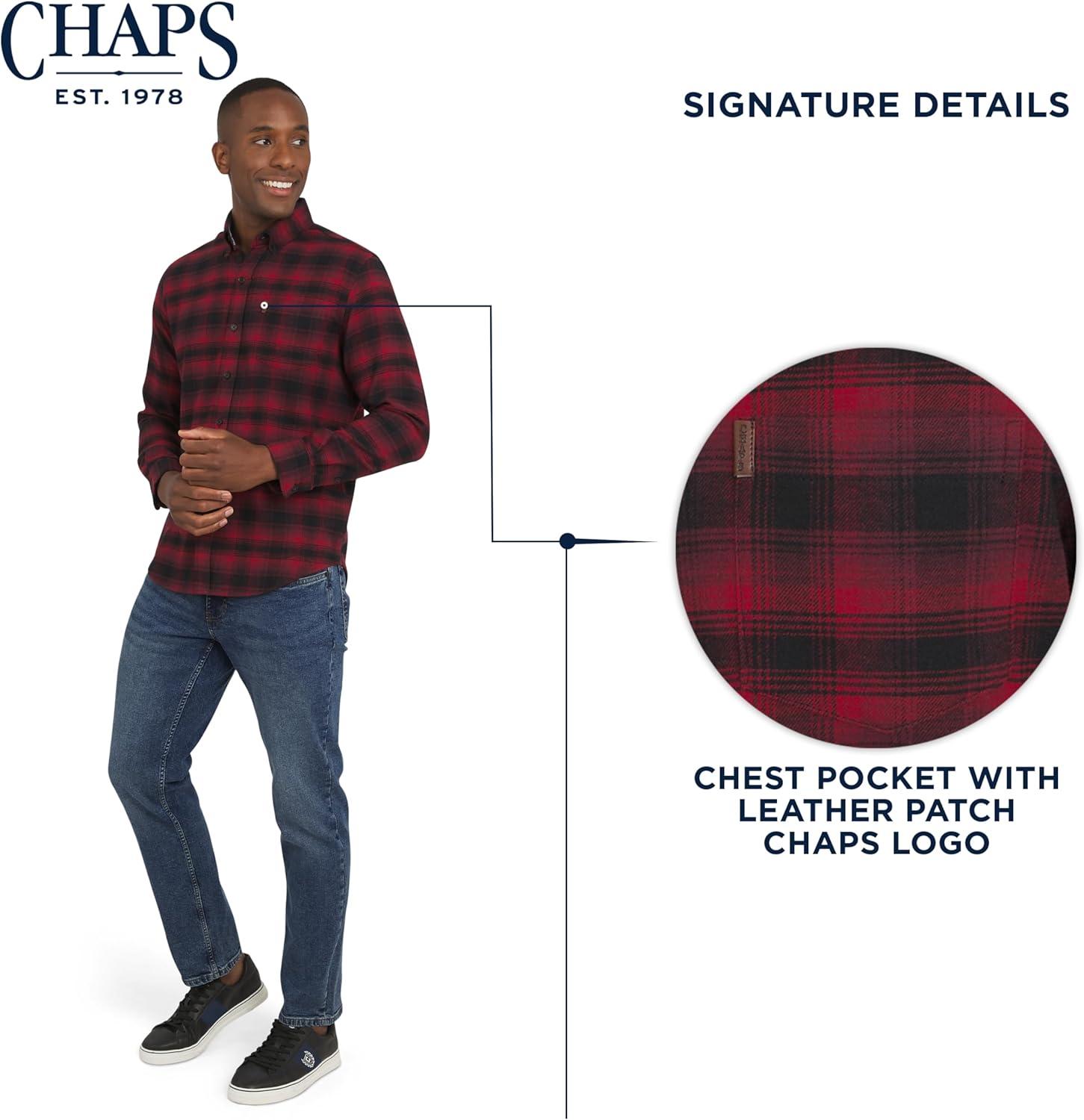 A true wardrobe classic, this Chaps flannel shirt embodies the brand's timeless American aesthetic that began in 1978. Designed for both comfort and versatility, it has a plush look and feel that easily transitions from a relaxed weekend at home to a casual get-together with friends. With a range of sharp designs and vibrant colors, you can effortlessly elevate your style. Pair it with jeans or chinos for a classic look, or wear it open over a t-shirt for a more relaxed, layered feel. Experience the superior comfort of our super-soft, woven, yarn-dyed twill flannel. This premium blend of cotton, polyester, and spandex provides a perfect balance of softness, breathability, and two-way stretch for ultimate freedom of movement. Its rich colors and intricate patterns are designed for lasting quality, ensuring they won't fade even after countless washes. This shirt not only looks great but is also machine washable for convenient, low-maintenance care. This long-sleeve shirt is designed with a classic fit and thoughtful details that stand the test of time. It features a sophisticated button-down collar, a convenient chest pocket with a signature Chaps leather patch logo, and a back pleated yoke with a locker loop. The scooped hem allows you to wear it tucked in or untucked for different looks, while the button closures on the cuffs add a polished finish. Available in a wide range of sizes, this flannel is a versatile and durable addition to any wardrobe.