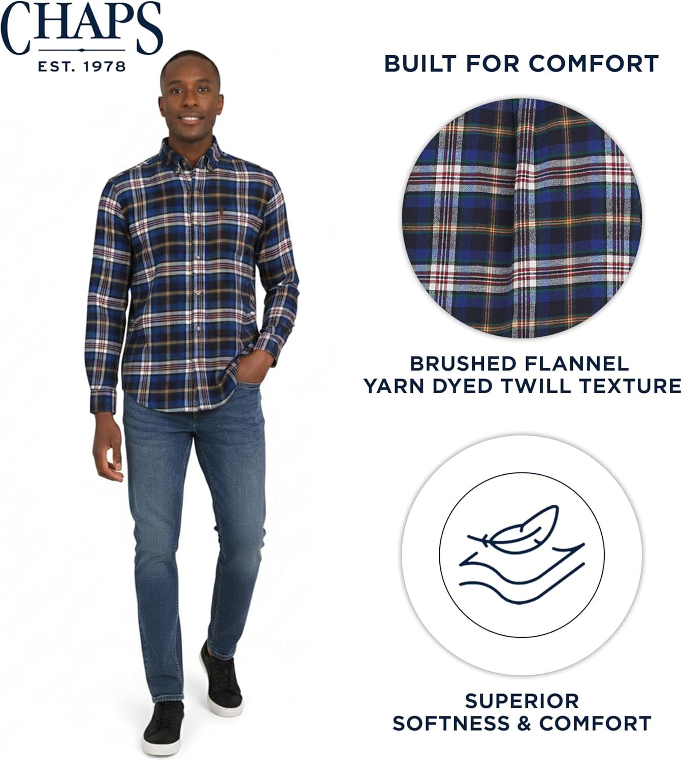 A true wardrobe classic, this Chaps flannel shirt embodies the brand's timeless American aesthetic that began in 1978. Designed for both comfort and versatility, it has a plush look and feel that easily transitions from a relaxed weekend at home to a casual get-together with friends. With a range of sharp designs and vibrant colors, you can effortlessly elevate your style. Pair it with jeans or chinos for a classic look, or wear it open over a t-shirt for a more relaxed, layered feel. Experience the superior comfort of our super-soft, woven, yarn-dyed twill flannel. This premium blend of cotton, polyester, and spandex provides a perfect balance of softness, breathability, and two-way stretch for ultimate freedom of movement. Its rich colors and intricate patterns are designed for lasting quality, ensuring they won't fade even after countless washes. This shirt not only looks great but is also machine washable for convenient, low-maintenance care. This long-sleeve shirt is designed with a classic fit and thoughtful details that stand the test of time. It features a sophisticated button-down collar, a convenient chest pocket with a signature Chaps leather patch logo, and a back pleated yoke with a locker loop. The scooped hem allows you to wear it tucked in or untucked for different looks, while the button closures on the cuffs add a polished finish. Available in a wide range of sizes, this flannel is a versatile and durable addition to any wardrobe.