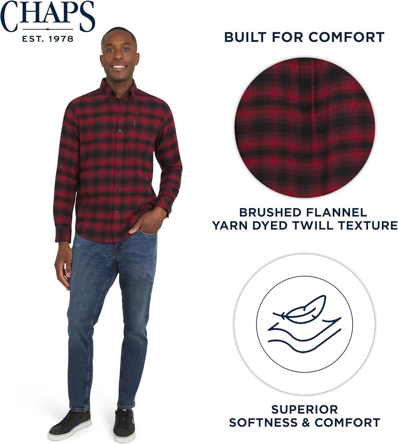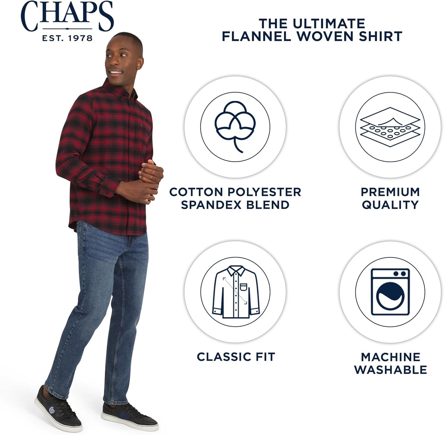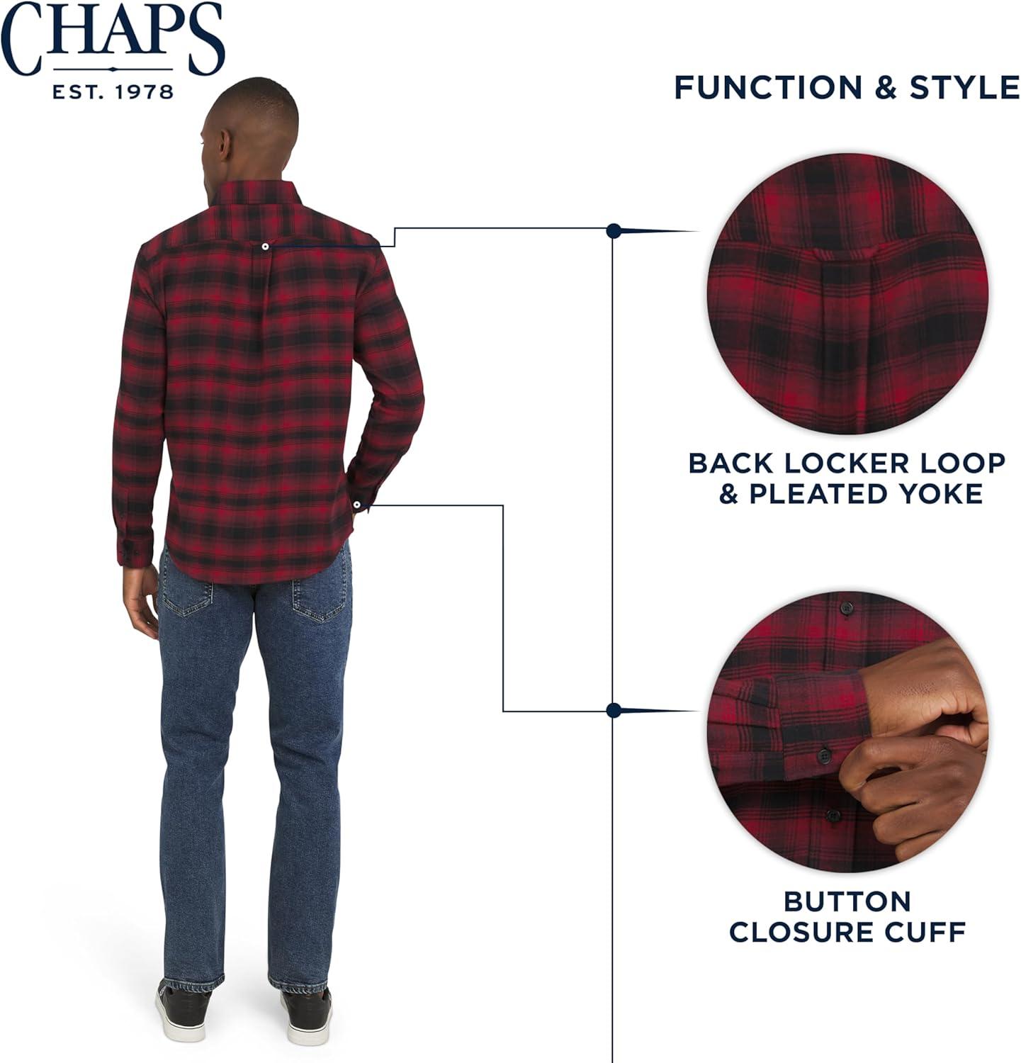 A true wardrobe classic, this Chaps flannel shirt embodies the brand's timeless American aesthetic that began in 1978. Designed for both comfort and versatility, it has a plush look and feel that easily transitions from a relaxed weekend at home to a casual get-together with friends. With a range of sharp designs and vibrant colors, you can effortlessly elevate your style. Pair it with jeans or chinos for a classic look, or wear it open over a t-shirt for a more relaxed, layered feel. Experience the superior comfort of our super-soft, woven, yarn-dyed twill flannel. This premium blend of cotton, polyester, and spandex provides a perfect balance of softness, breathability, and two-way stretch for ultimate freedom of movement. Its rich colors and intricate patterns are designed for lasting quality, ensuring they won't fade even after countless washes. This shirt not only looks great but is also machine washable for convenient, low-maintenance care. This long-sleeve shirt is designed with a classic fit and thoughtful details that stand the test of time. It features a sophisticated button-down collar, a convenient chest pocket with a signature Chaps leather patch logo, and a back pleated yoke with a locker loop. The scooped hem allows you to wear it tucked in or untucked for different looks, while the button closures on the cuffs add a polished finish. Available in a wide range of sizes, this flannel is a versatile and durable addition to any wardrobe.