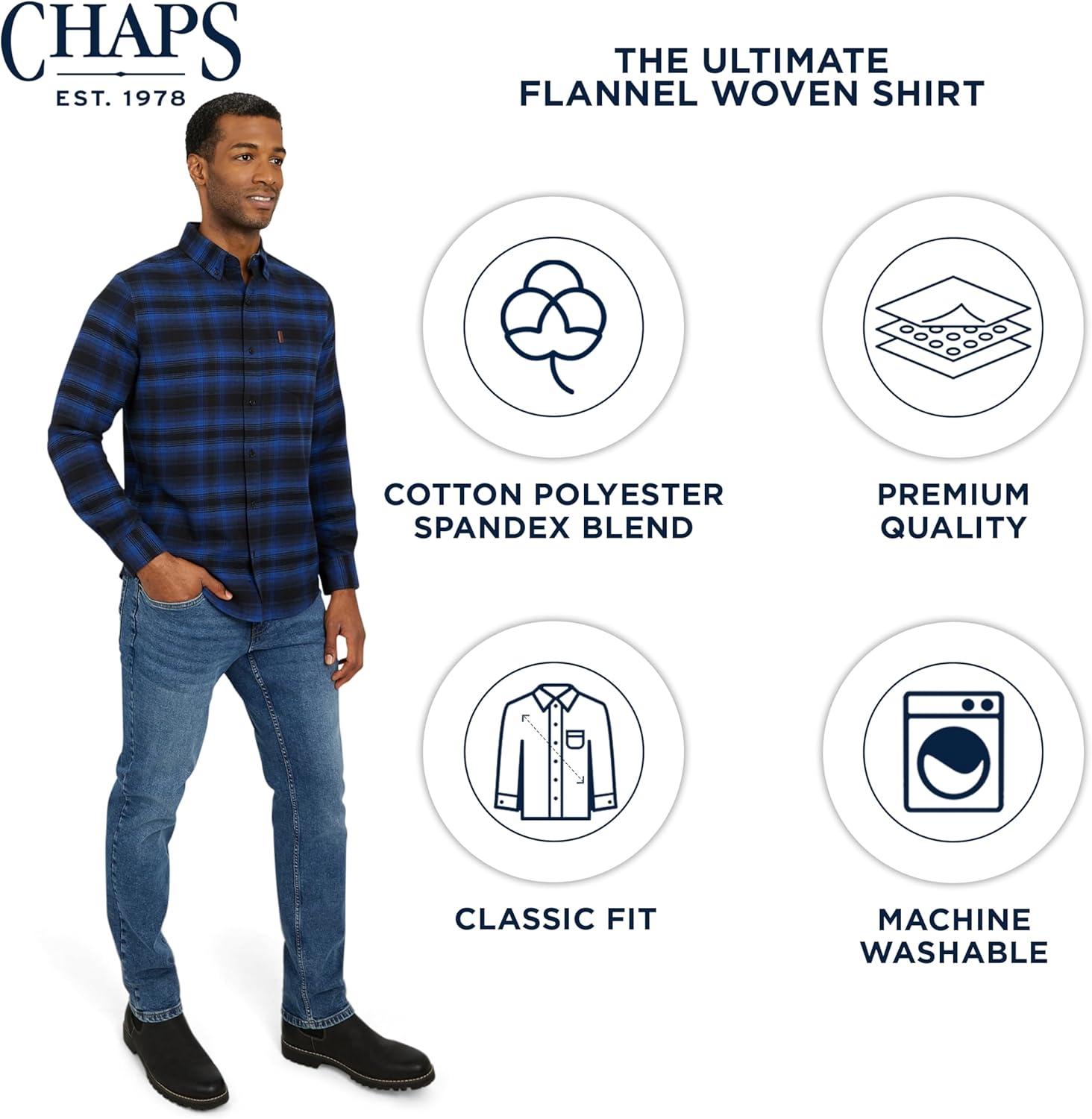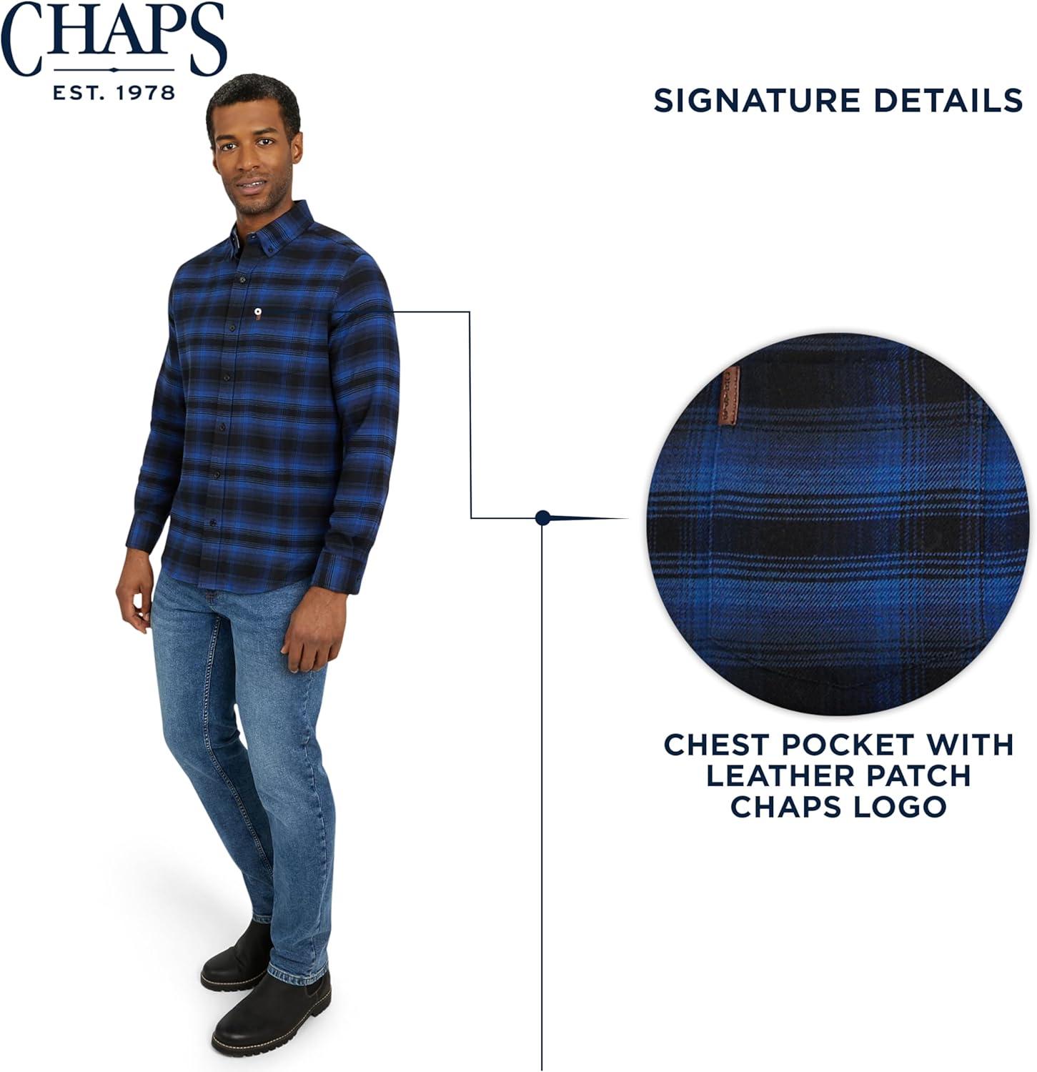 A true wardrobe classic, this Chaps flannel shirt embodies the brand's timeless American aesthetic that began in 1978. Designed for both comfort and versatility, it has a plush look and feel that easily transitions from a relaxed weekend at home to a casual get-together with friends. With a range of sharp designs and vibrant colors, you can effortlessly elevate your style. Pair it with jeans or chinos for a classic look, or wear it open over a t-shirt for a more relaxed, layered feel. Experience the superior comfort of our super-soft, woven, yarn-dyed twill flannel. This premium blend of cotton, polyester, and spandex provides a perfect balance of softness, breathability, and two-way stretch for ultimate freedom of movement. Its rich colors and intricate patterns are designed for lasting quality, ensuring they won't fade even after countless washes. This shirt not only looks great but is also machine washable for convenient, low-maintenance care. This long-sleeve shirt is designed with a classic fit and thoughtful details that stand the test of time. It features a sophisticated button-down collar, a convenient chest pocket with a signature Chaps leather patch logo, and a back pleated yoke with a locker loop. The scooped hem allows you to wear it tucked in or untucked for different looks, while the button closures on the cuffs add a polished finish. Available in a wide range of sizes, this flannel is a versatile and durable addition to any wardrobe.