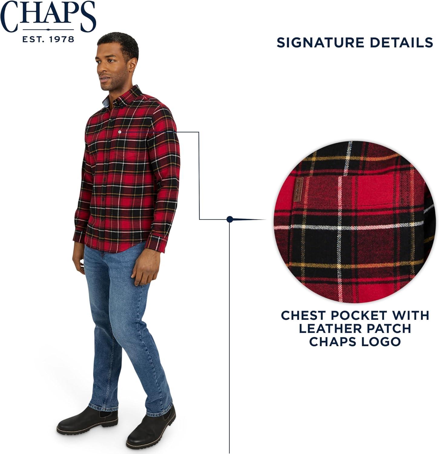 A true wardrobe classic, this Chaps flannel shirt embodies the brand's timeless American aesthetic that began in 1978. Designed for both comfort and versatility, it has a plush look and feel that easily transitions from a relaxed weekend at home to a casual get-together with friends. With a range of sharp designs and vibrant colors, you can effortlessly elevate your style. Pair it with jeans or chinos for a classic look, or wear it open over a t-shirt for a more relaxed, layered feel. Experience the superior comfort of our super-soft, woven, yarn-dyed twill flannel. This premium blend of cotton, polyester, and spandex provides a perfect balance of softness, breathability, and two-way stretch for ultimate freedom of movement. Its rich colors and intricate patterns are designed for lasting quality, ensuring they won't fade even after countless washes. This shirt not only looks great but is also machine washable for convenient, low-maintenance care. This long-sleeve shirt is designed with a classic fit and thoughtful details that stand the test of time. It features a sophisticated button-down collar, a convenient chest pocket with a signature Chaps leather patch logo, and a back pleated yoke with a locker loop. The scooped hem allows you to wear it tucked in or untucked for different looks, while the button closures on the cuffs add a polished finish. Available in a wide range of sizes, this flannel is a versatile and durable addition to any wardrobe.