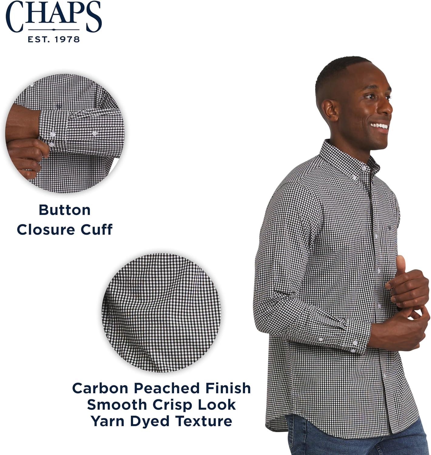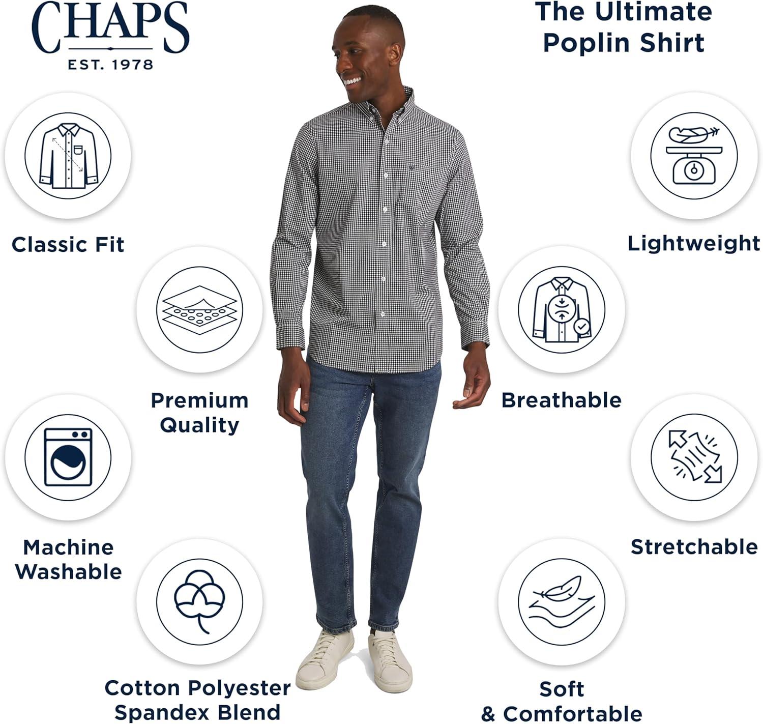 The Chaps legacy, born in 1978, has always been about celebrating a timeless American aesthetic. Our designs honor this heritage by blending classic, spirited style with the needs of modern life. This poplin shirt is a prime example of our commitment to quality and versatility, offering a polished look that's perfect for any occasion. From essential workwear to a casual weekend, this shirt is a staple that elevates your style with effortless comfort and a nod to a storied tradition. Experience superior comfort with this stretch poplin shirt. The fabric, a carefully chosen blend of cotton, polyester, and spandex, is soft, breathable, and flexible enough for all-day wear. A carbon-peached finish gives the material a luxurious, velvety texture, while the natural poplin plain weave provides a smooth, crisp surface with a subtle sheen. The yarn-dyed fabric ensures that its rich, intricate patterns maintain their colorfastness, delivering exceptional durability and a refined appearance that will last. Thoughtful design details complete this classic long-sleeve shirt. The classic fit offers a comfortable silhouette, while a button-down collar and adjustable cuff buttons provide a sharp, clean look. The back pleated yoke and locker loop ensure a full range of motion and an easy way to hang the shirt, and the scooped hem allows for a versatile tucked or untucked style. A chest pocket with an embroidered logo adds a final touch of signature detail. This shirt is also machine washable and wrinkle-resistant, making it a truly low-maintenance addition to your wardrobe.