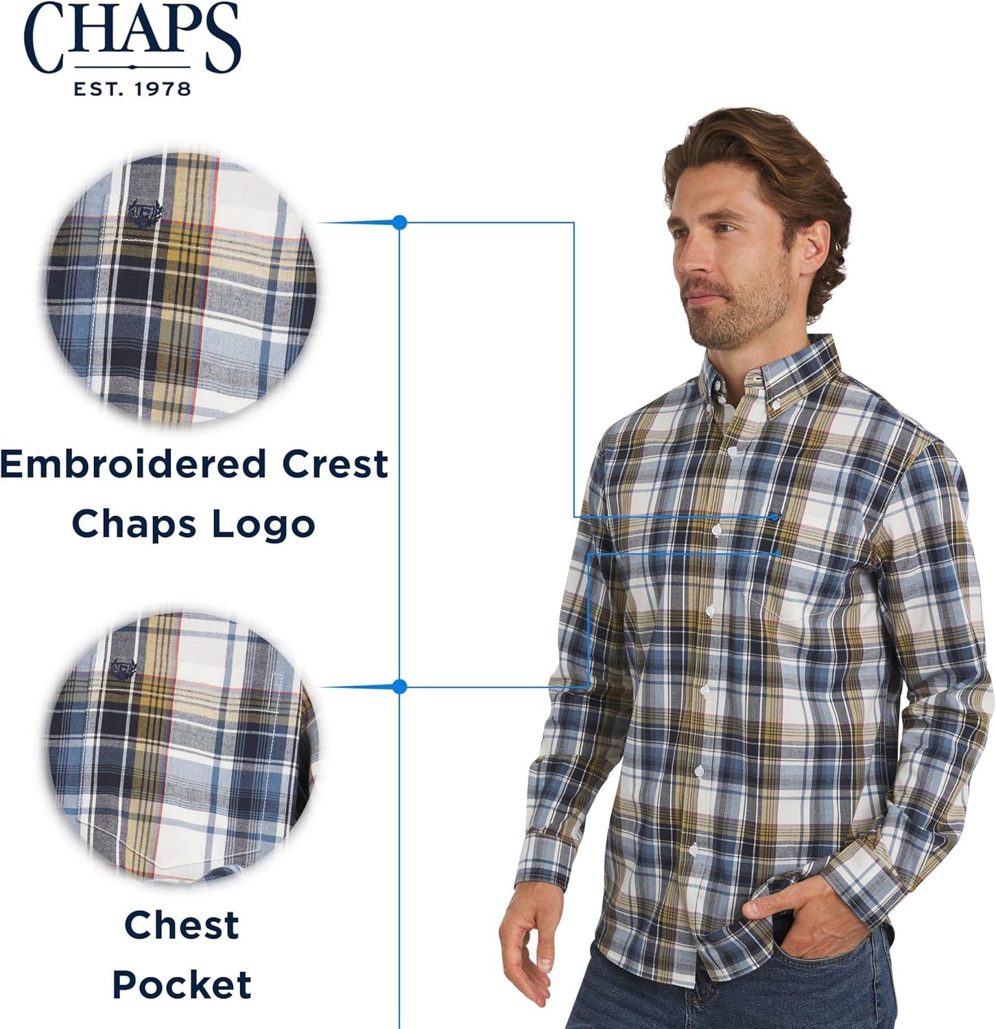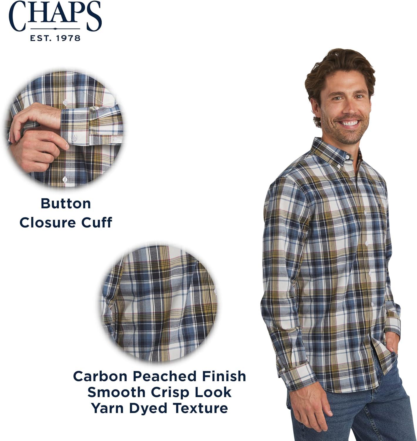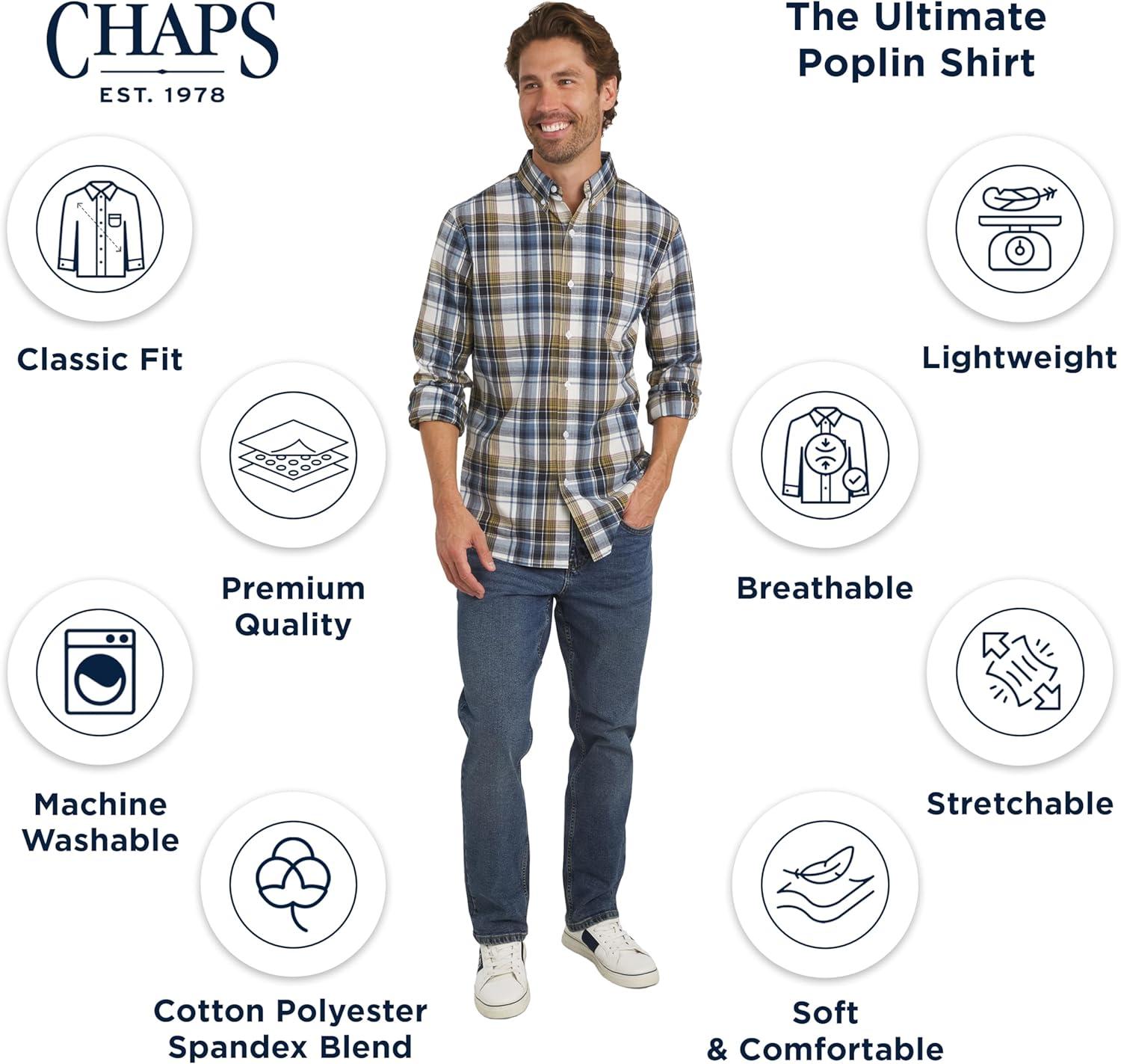 The Chaps legacy, born in 1978, has always been about celebrating a timeless American aesthetic. Our designs honor this heritage by blending classic, spirited style with the needs of modern life. This poplin shirt is a prime example of our commitment to quality and versatility, offering a polished look that's perfect for any occasion. From essential workwear to a casual weekend, this shirt is a staple that elevates your style with effortless comfort and a nod to a storied tradition. Experience superior comfort with this stretch poplin shirt. The fabric, a carefully chosen blend of cotton, polyester, and spandex, is soft, breathable, and flexible enough for all-day wear. A carbon-peached finish gives the material a luxurious, velvety texture, while the natural poplin plain weave provides a smooth, crisp surface with a subtle sheen. The yarn-dyed fabric ensures that its rich, intricate patterns maintain their colorfastness, delivering exceptional durability and a refined appearance that will last. Thoughtful design details complete this classic long-sleeve shirt. The classic fit offers a comfortable silhouette, while a button-down collar and adjustable cuff buttons provide a sharp, clean look. The back pleated yoke and locker loop ensure a full range of motion and an easy way to hang the shirt, and the scooped hem allows for a versatile tucked or untucked style. A chest pocket with an embroidered logo adds a final touch of signature detail. This shirt is also machine washable and wrinkle-resistant, making it a truly low-maintenance addition to your wardrobe.