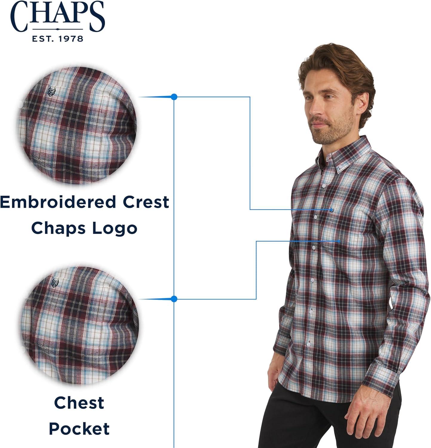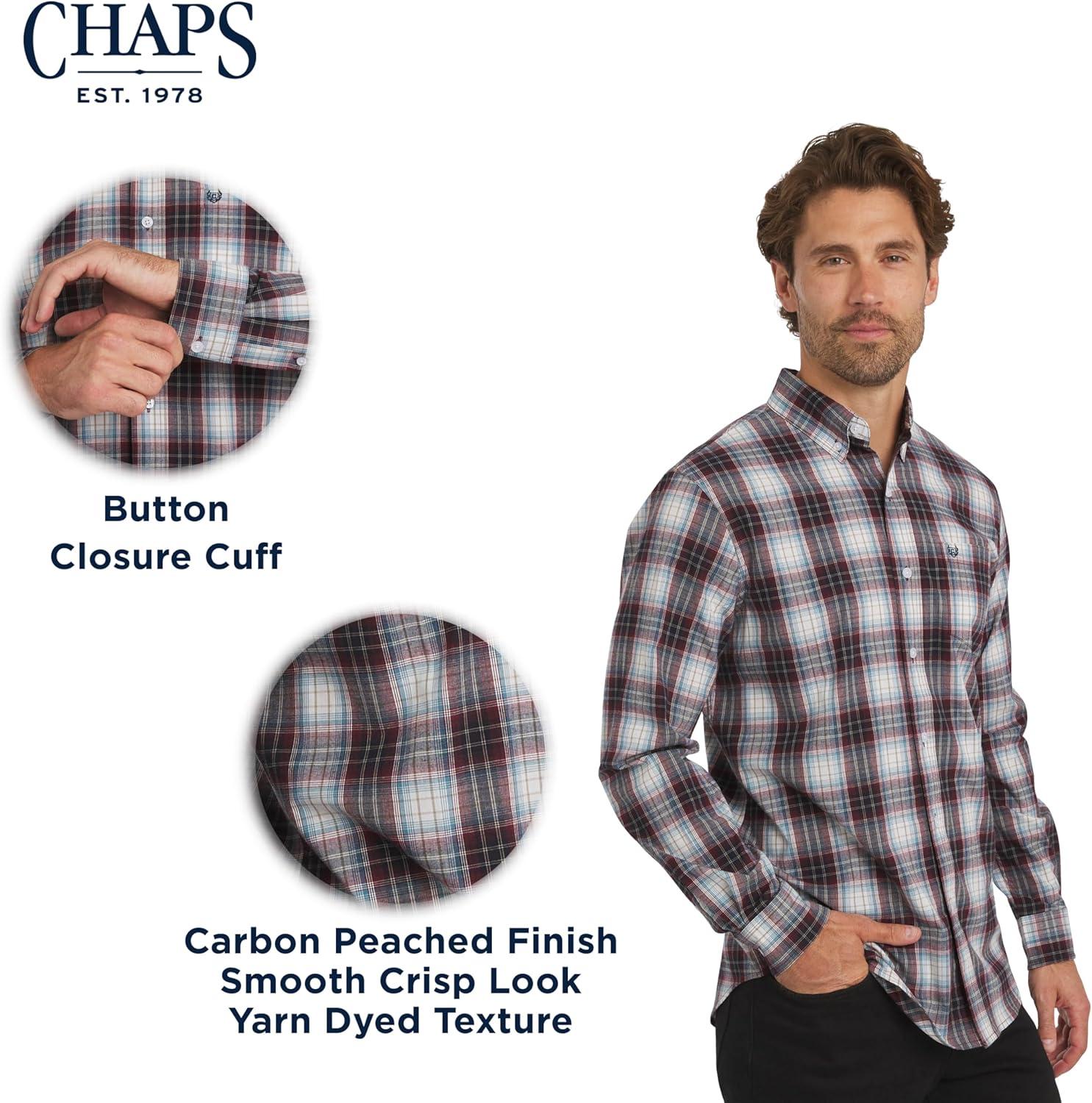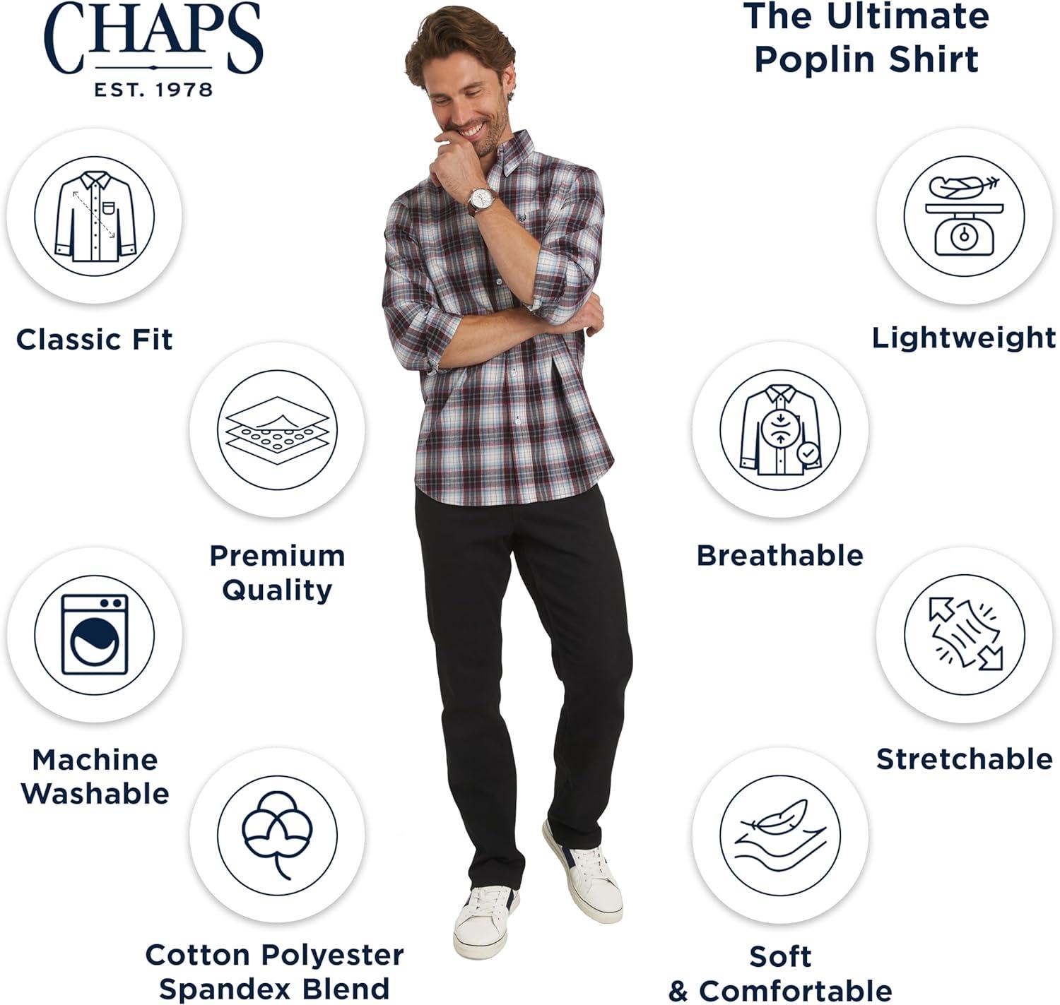 The Chaps legacy, born in 1978, has always been about celebrating a timeless American aesthetic. Our designs honor this heritage by blending classic, spirited style with the needs of modern life. This poplin shirt is a prime example of our commitment to quality and versatility, offering a polished look that's perfect for any occasion. From essential workwear to a casual weekend, this shirt is a staple that elevates your style with effortless comfort and a nod to a storied tradition. Experience superior comfort with this stretch poplin shirt. The fabric, a carefully chosen blend of cotton, polyester, and spandex, is soft, breathable, and flexible enough for all-day wear. A carbon-peached finish gives the material a luxurious, velvety texture, while the natural poplin plain weave provides a smooth, crisp surface with a subtle sheen. The yarn-dyed fabric ensures that its rich, intricate patterns maintain their colorfastness, delivering exceptional durability and a refined appearance that will last. Thoughtful design details complete this classic long-sleeve shirt. The classic fit offers a comfortable silhouette, while a button-down collar and adjustable cuff buttons provide a sharp, clean look. The back pleated yoke and locker loop ensure a full range of motion and an easy way to hang the shirt, and the scooped hem allows for a versatile tucked or untucked style. A chest pocket with an embroidered logo adds a final touch of signature detail. This shirt is also machine washable and wrinkle-resistant, making it a truly low-maintenance addition to your wardrobe.