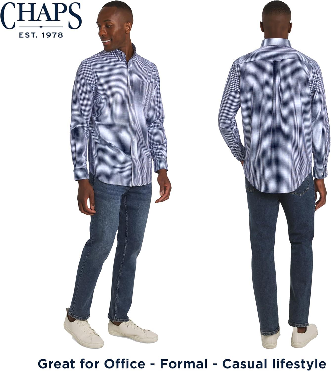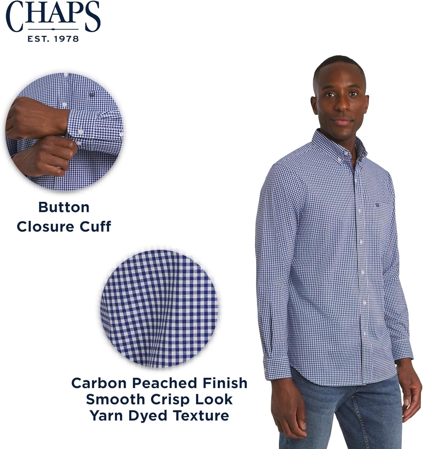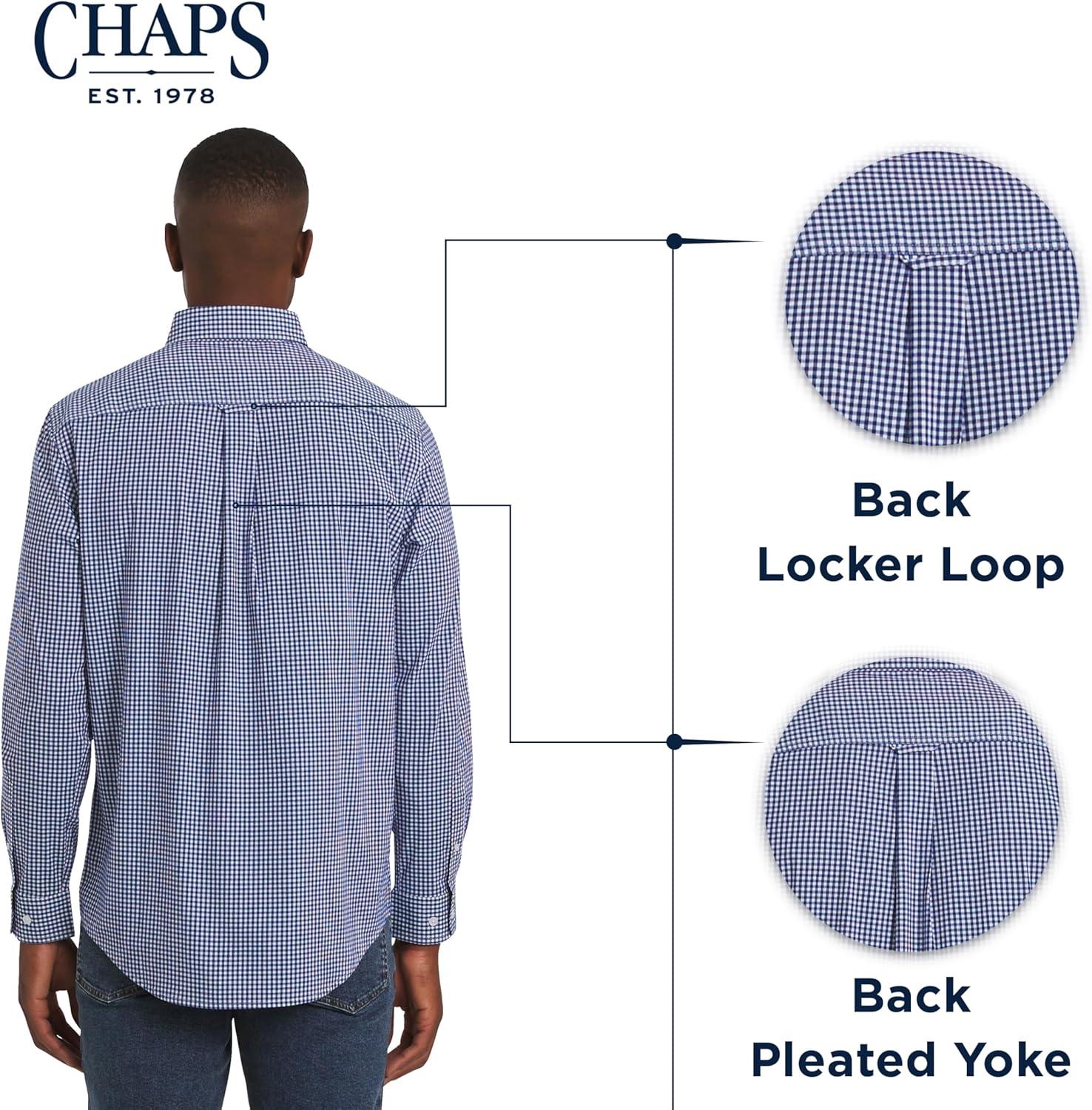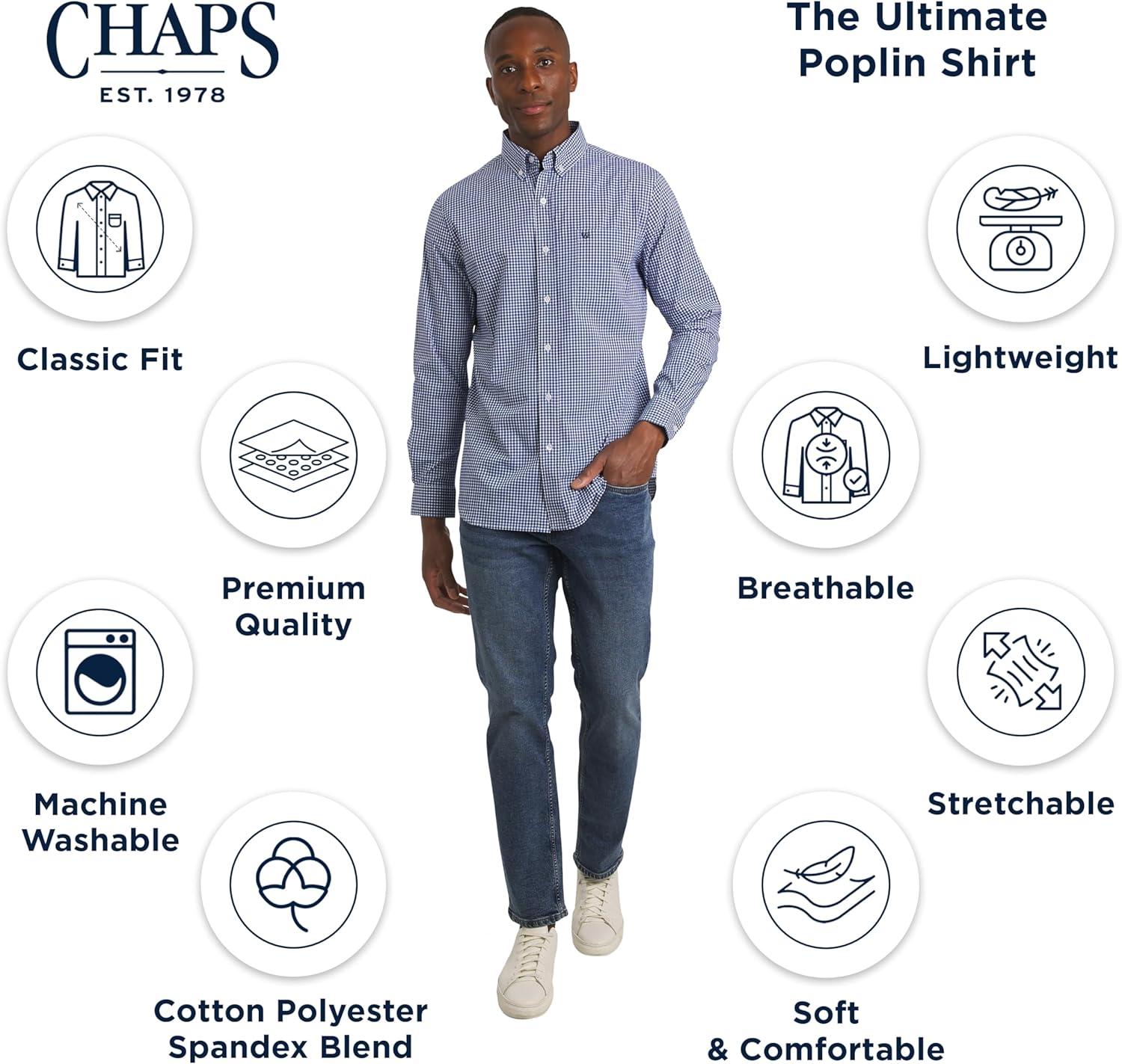 The Chaps legacy, born in 1978, has always been about celebrating a timeless American aesthetic. Our designs honor this heritage by blending classic, spirited style with the needs of modern life. This poplin shirt is a prime example of our commitment to quality and versatility, offering a polished look that's perfect for any occasion. From essential workwear to a casual weekend, this shirt is a staple that elevates your style with effortless comfort and a nod to a storied tradition. Experience superior comfort with this stretch poplin shirt. The fabric, a carefully chosen blend of cotton, polyester, and spandex, is soft, breathable, and flexible enough for all-day wear. A carbon-peached finish gives the material a luxurious, velvety texture, while the natural poplin plain weave provides a smooth, crisp surface with a subtle sheen. The yarn-dyed fabric ensures that its rich, intricate patterns maintain their colorfastness, delivering exceptional durability and a refined appearance that will last. Thoughtful design details complete this classic long-sleeve shirt. The classic fit offers a comfortable silhouette, while a button-down collar and adjustable cuff buttons provide a sharp, clean look. The back pleated yoke and locker loop ensure a full range of motion and an easy way to hang the shirt, and the scooped hem allows for a versatile tucked or untucked style. A chest pocket with an embroidered logo adds a final touch of signature detail. This shirt is also machine washable and wrinkle-resistant, making it a truly low-maintenance addition to your wardrobe.
