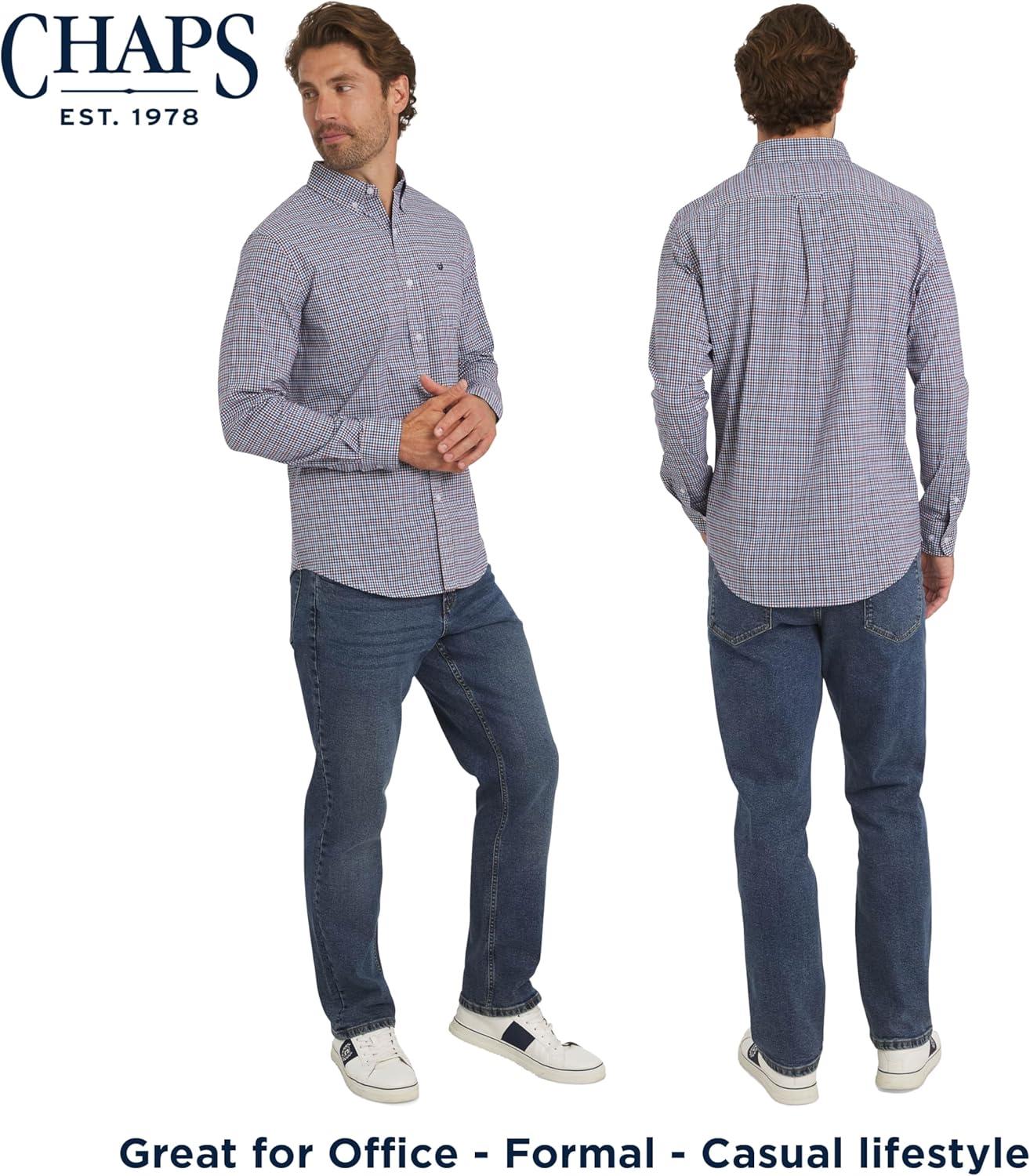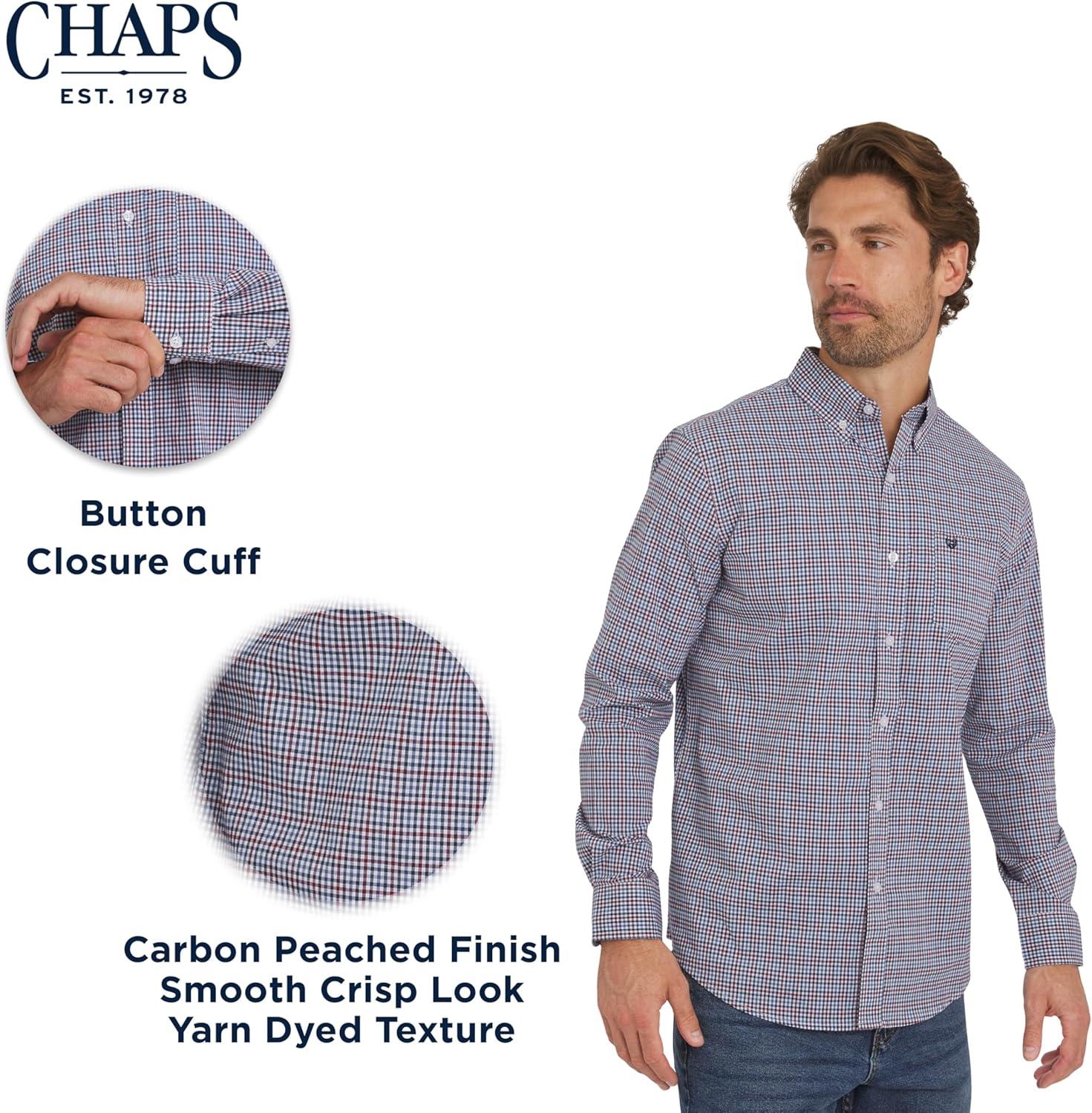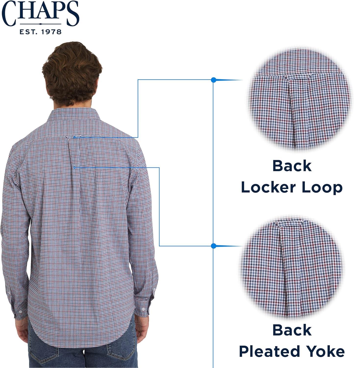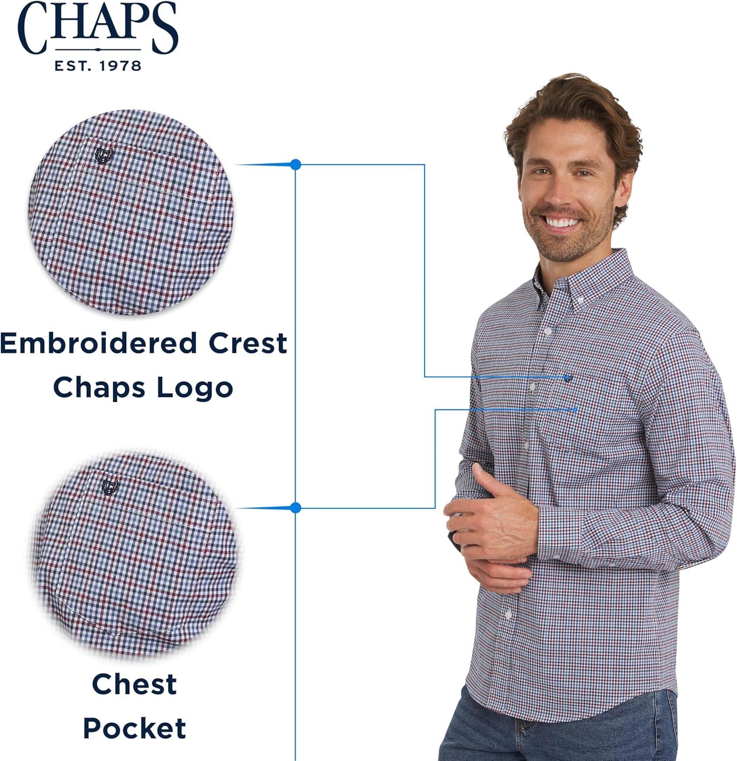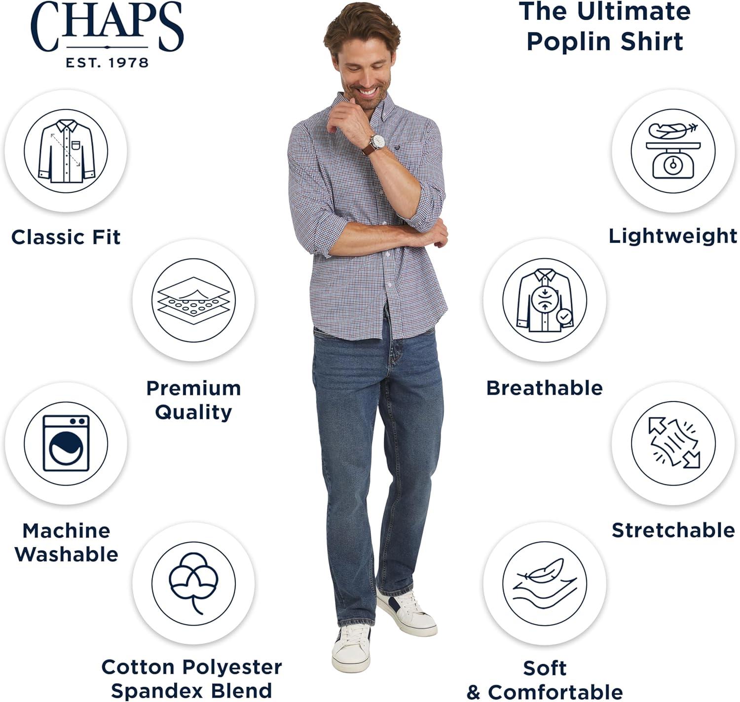 The Chaps legacy, born in 1978, has always been about celebrating a timeless American aesthetic. Our designs honor this heritage by blending classic, spirited style with the needs of modern life. This poplin shirt is a prime example of our commitment to quality and versatility, offering a polished look that's perfect for any occasion. From essential workwear to a casual weekend, this shirt is a staple that elevates your style with effortless comfort and a nod to a storied tradition. Experience superior comfort with this stretch poplin shirt. The fabric, a carefully chosen blend of cotton, polyester, and spandex, is soft, breathable, and flexible enough for all-day wear. A carbon-peached finish gives the material a luxurious, velvety texture, while the natural poplin plain weave provides a smooth, crisp surface with a subtle sheen. The yarn-dyed fabric ensures that its rich, intricate patterns maintain their colorfastness, delivering exceptional durability and a refined appearance that will last. Thoughtful design details complete this classic long-sleeve shirt. The classic fit offers a comfortable silhouette, while a button-down collar and adjustable cuff buttons provide a sharp, clean look. The back pleated yoke and locker loop ensure a full range of motion and an easy way to hang the shirt, and the scooped hem allows for a versatile tucked or untucked style. A chest pocket with an embroidered logo adds a final touch of signature detail. This shirt is also machine washable and wrinkle-resistant, making it a truly low-maintenance addition to your wardrobe.