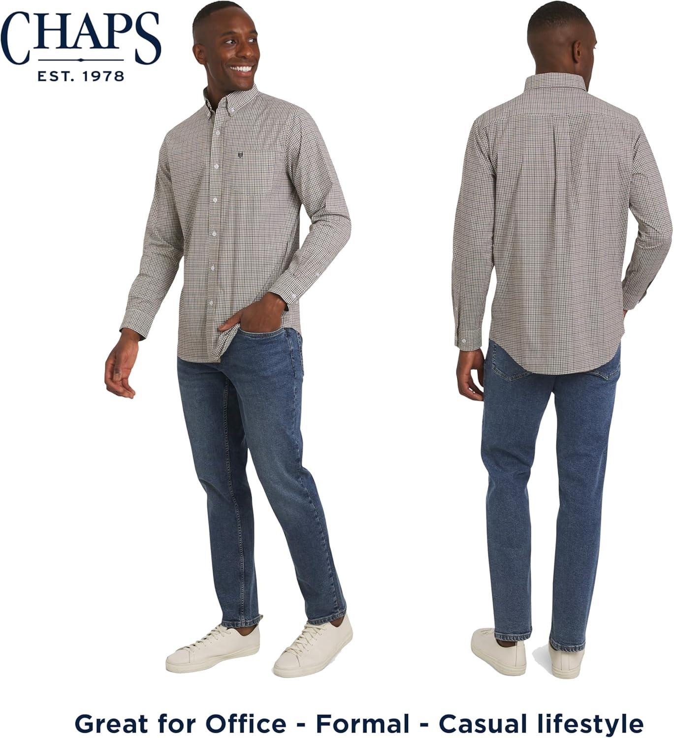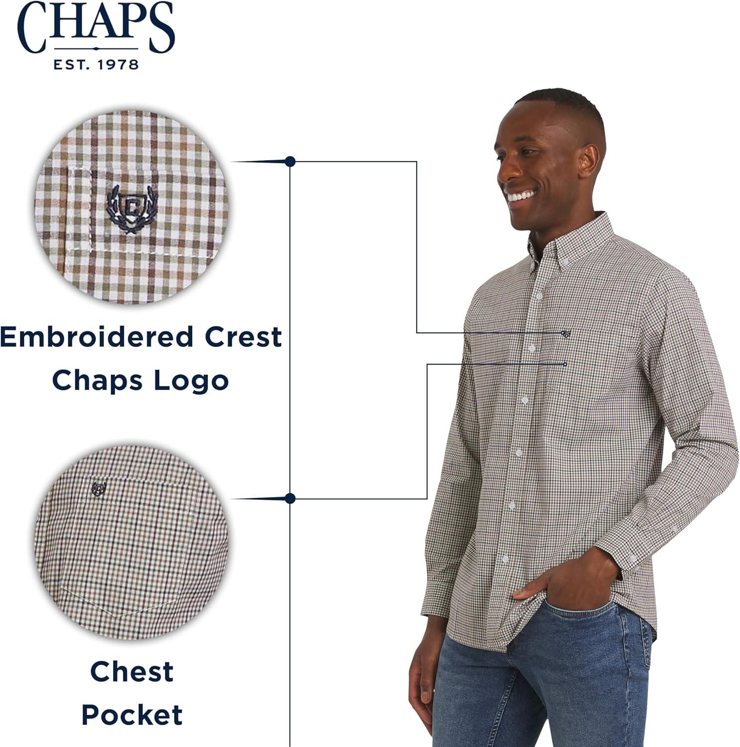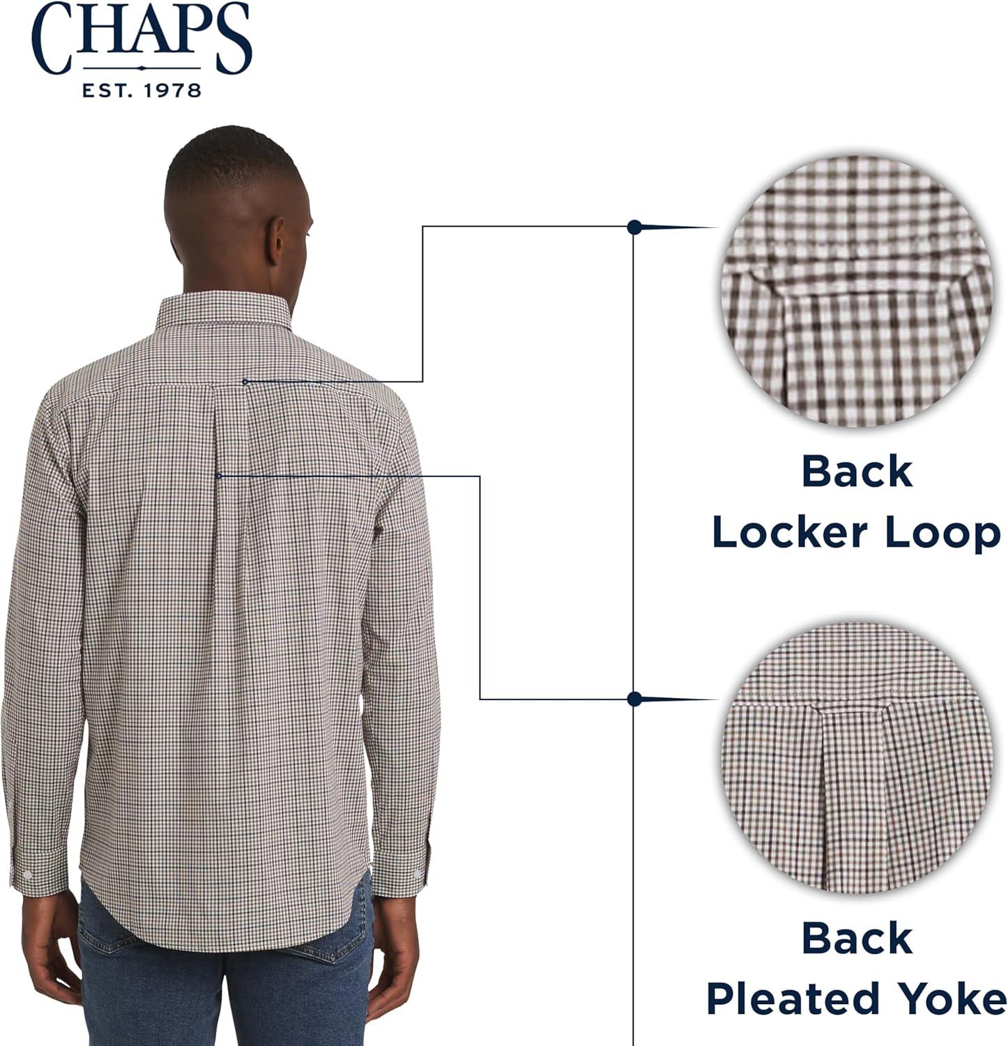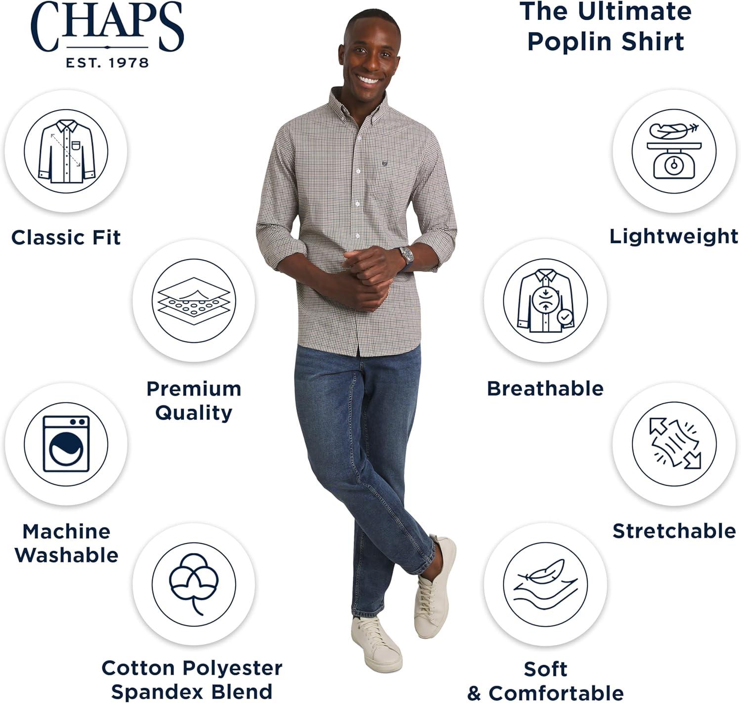 The Chaps legacy, born in 1978, has always been about celebrating a timeless American aesthetic. Our designs honor this heritage by blending classic, spirited style with the needs of modern life. This poplin shirt is a prime example of our commitment to quality and versatility, offering a polished look that's perfect for any occasion. From essential workwear to a casual weekend, this shirt is a staple that elevates your style with effortless comfort and a nod to a storied tradition. Experience superior comfort with this stretch poplin shirt. The fabric, a carefully chosen blend of cotton, polyester, and spandex, is soft, breathable, and flexible enough for all-day wear. A carbon-peached finish gives the material a luxurious, velvety texture, while the natural poplin plain weave provides a smooth, crisp surface with a subtle sheen. The yarn-dyed fabric ensures that its rich, intricate patterns maintain their colorfastness, delivering exceptional durability and a refined appearance that will last. Thoughtful design details complete this classic long-sleeve shirt. The classic fit offers a comfortable silhouette, while a button-down collar and adjustable cuff buttons provide a sharp, clean look. The back pleated yoke and locker loop ensure a full range of motion and an easy way to hang the shirt, and the scooped hem allows for a versatile tucked or untucked style. A chest pocket with an embroidered logo adds a final touch of signature detail. This shirt is also machine washable and wrinkle-resistant, making it a truly low-maintenance addition to your wardrobe.