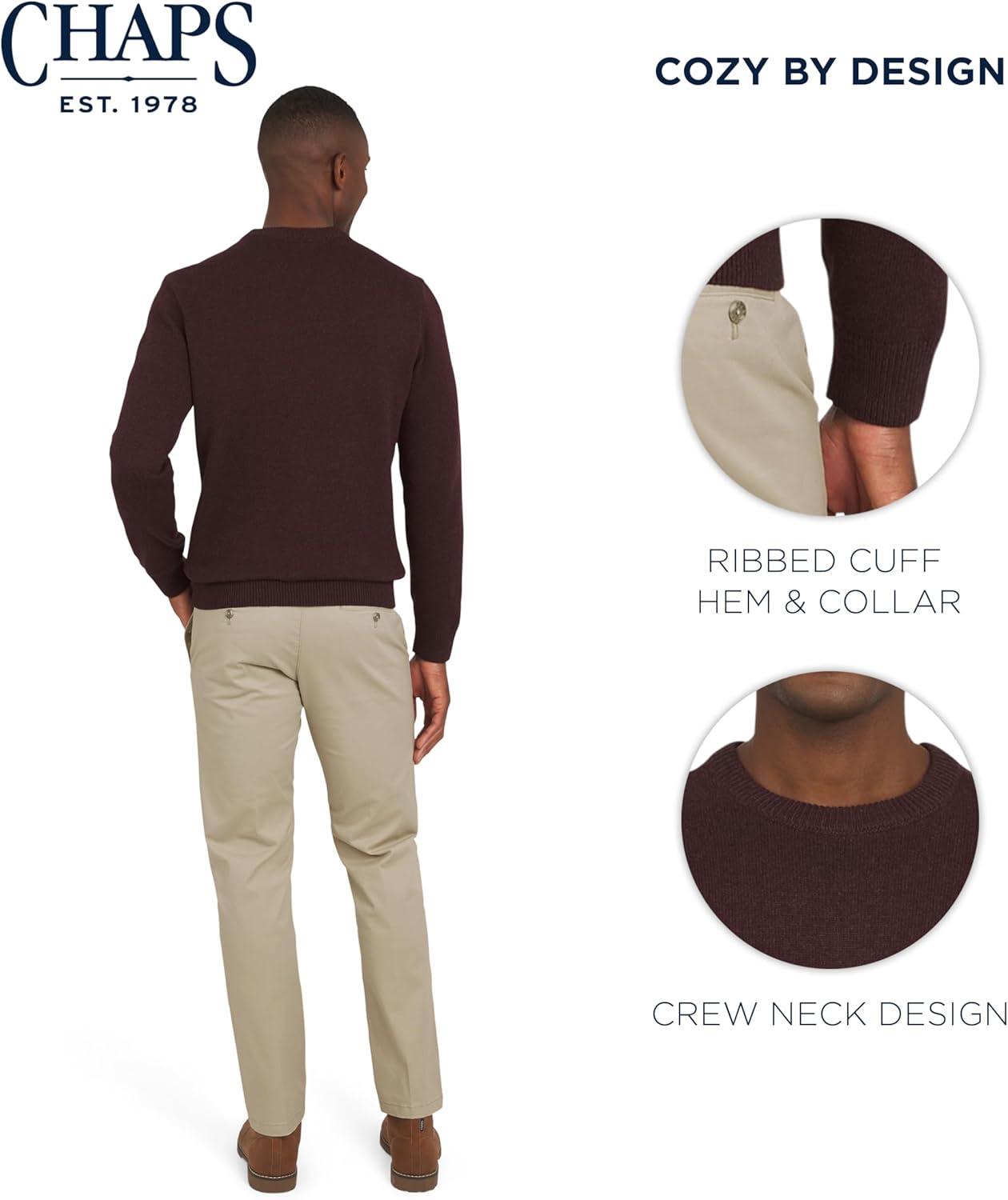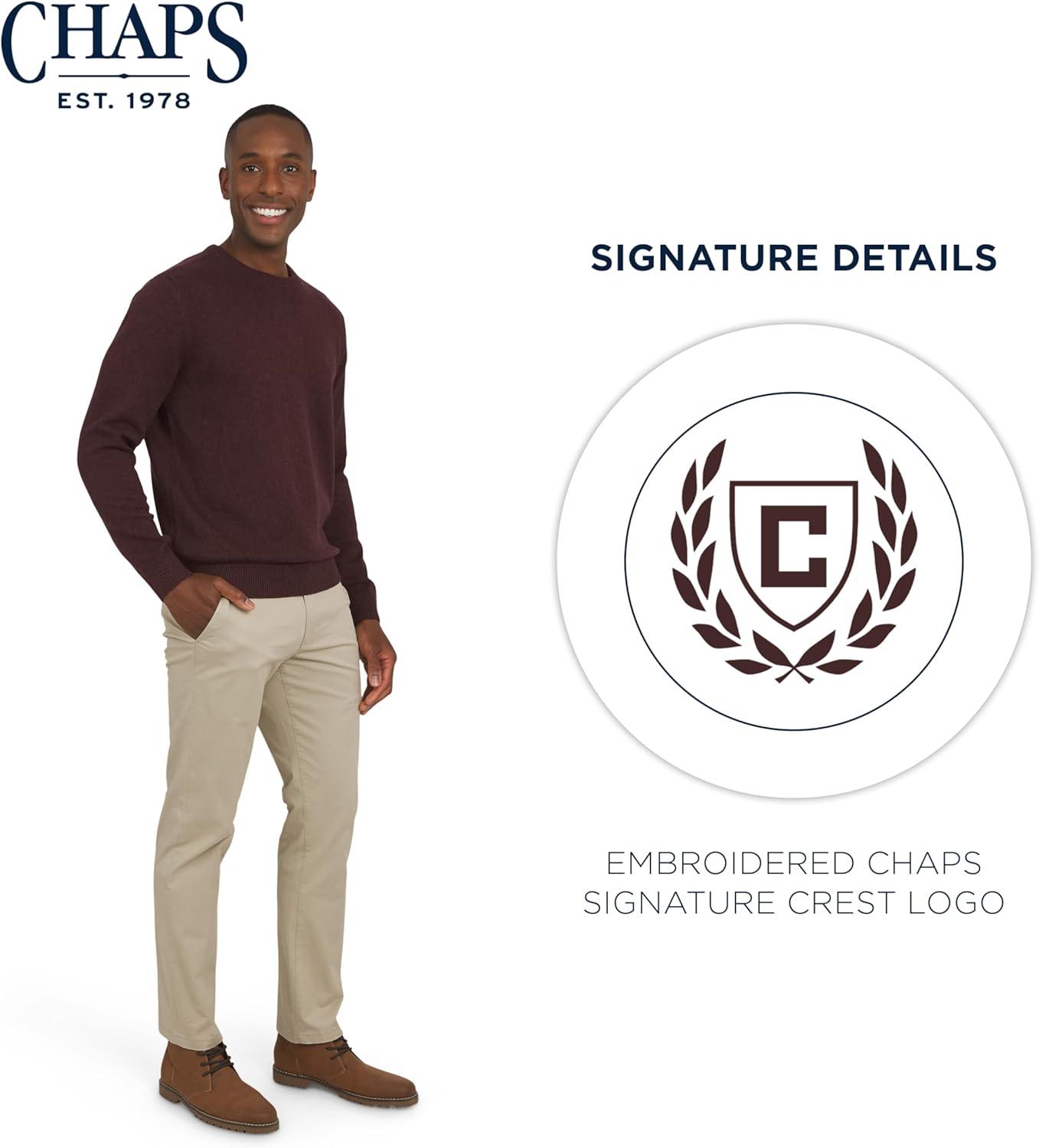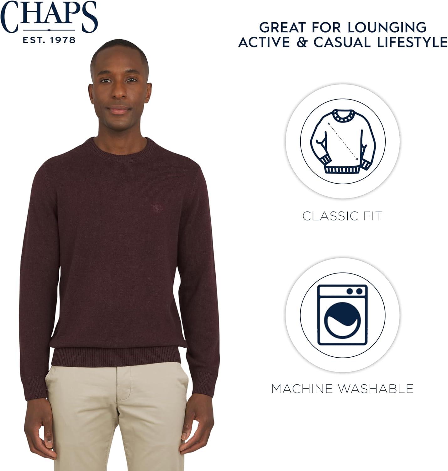 A true wardrobe classic, this Chaps crewneck sweater embodies the brand's timeless American aesthetic, a legacy that began in 1978. Designed to blend traditional style with modern, everyday comfort, its refined and clean look transitions effortlessly from the office to a weekend outing. With a curated selection of classic colors, this sweater is the perfect piece to showcase your personal style all season long. For a semi-formal event, pair it with dress pants and a blazer, or keep it casual with jeans or chinos for a relaxed feel. Experience the superior comfort and warmth of our mid-weight 100% cotton jersey. This soft, 7-gauge fabric provides exceptional warmth with a comfortable, non-bulky feel, making it the perfect layering piece. Its single-knit construction offers a smooth, knit texture and a stretchy design for unrestricted movement, while the classic ribbed cuffs, hem, and collar provide a snug fit that locks in warmth. This cozy sweater is also machine washable for convenient, low-maintenance care, so it's always ready to wear again in no time. This garment is designed for a timeless look and features a classic fit that is easy to wear and comfortable for every body type. A straight hem provides a clean, modern look that is perfect for wearing untucked, while a crest Chaps logo on the chest adds a signature detail. With its durable construction and lasting quality, this sweater is a versatile and reliable addition to any wardrobe.