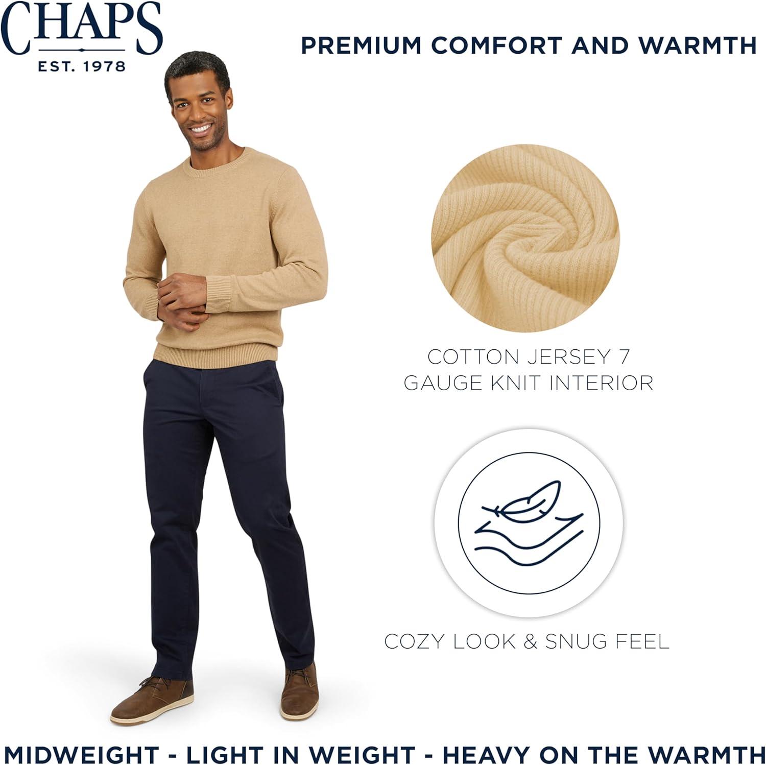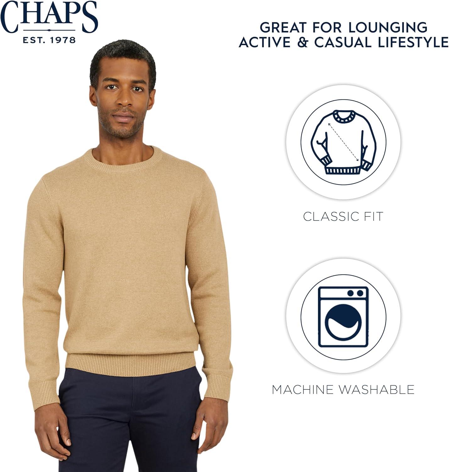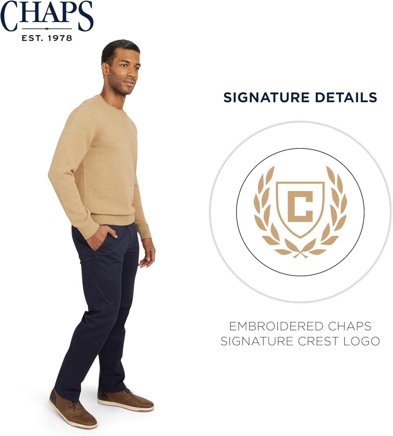 A true wardrobe classic, this Chaps crewneck sweater embodies the brand's timeless American aesthetic, a legacy that began in 1978. Designed to blend traditional style with modern, everyday comfort, its refined and clean look transitions effortlessly from the office to a weekend outing. With a curated selection of classic colors, this sweater is the perfect piece to showcase your personal style all season long. For a semi-formal event, pair it with dress pants and a blazer, or keep it casual with jeans or chinos for a relaxed feel. Experience the superior comfort and warmth of our mid-weight 100% cotton jersey. This soft, 7-gauge fabric provides exceptional warmth with a comfortable, non-bulky feel, making it the perfect layering piece. Its single-knit construction offers a smooth, knit texture and a stretchy design for unrestricted movement, while the classic ribbed cuffs, hem, and collar provide a snug fit that locks in warmth. This cozy sweater is also machine washable for convenient, low-maintenance care, so it's always ready to wear again in no time. This garment is designed for a timeless look and features a classic fit that is easy to wear and comfortable for every body type. A straight hem provides a clean, modern look that is perfect for wearing untucked, while a crest Chaps logo on the chest adds a signature detail. With its durable construction and lasting quality, this sweater is a versatile and reliable addition to any wardrobe.