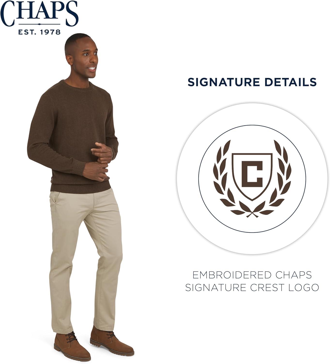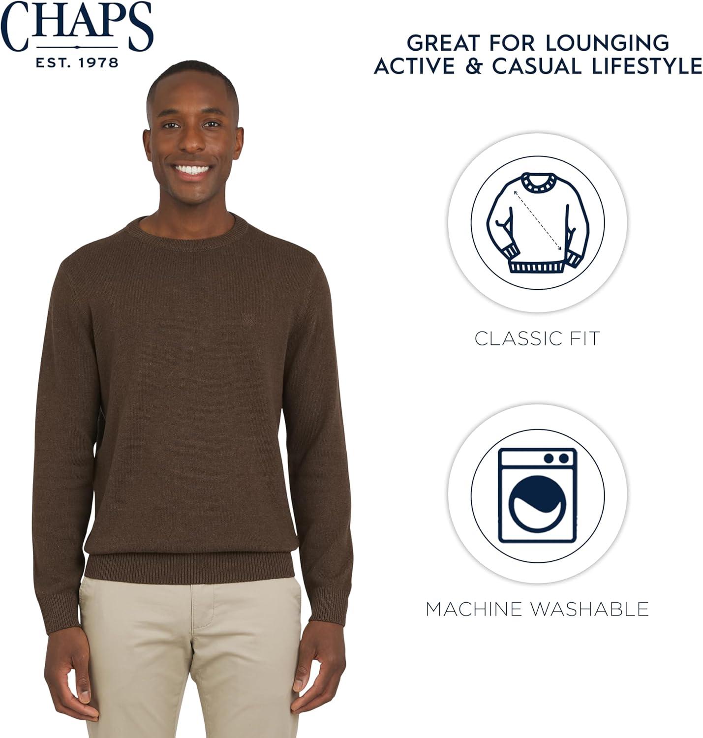 A true wardrobe classic, this Chaps crewneck sweater embodies the brand's timeless American aesthetic, a legacy that began in 1978. Designed to blend traditional style with modern, everyday comfort, its refined and clean look transitions effortlessly from the office to a weekend outing. With a curated selection of classic colors, this sweater is the perfect piece to showcase your personal style all season long. For a semi-formal event, pair it with dress pants and a blazer, or keep it casual with jeans or chinos for a relaxed feel. Experience the superior comfort and warmth of our mid-weight 100% cotton jersey. This soft, 7-gauge fabric provides exceptional warmth with a comfortable, non-bulky feel, making it the perfect layering piece. Its single-knit construction offers a smooth, knit texture and a stretchy design for unrestricted movement, while the classic ribbed cuffs, hem, and collar provide a snug fit that locks in warmth. This cozy sweater is also machine washable for convenient, low-maintenance care, so it's always ready to wear again in no time. This garment is designed for a timeless look and features a classic fit that is easy to wear and comfortable for every body type. A straight hem provides a clean, modern look that is perfect for wearing untucked, while a crest Chaps logo on the chest adds a signature detail. With its durable construction and lasting quality, this sweater is a versatile and reliable addition to any wardrobe.
