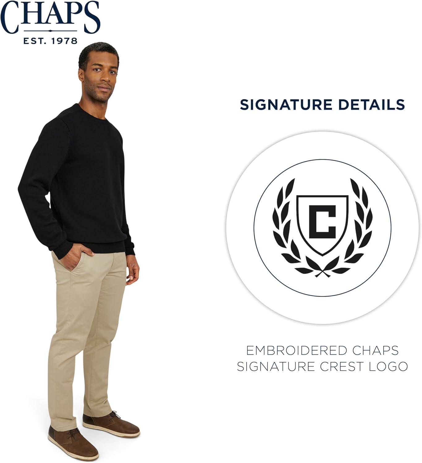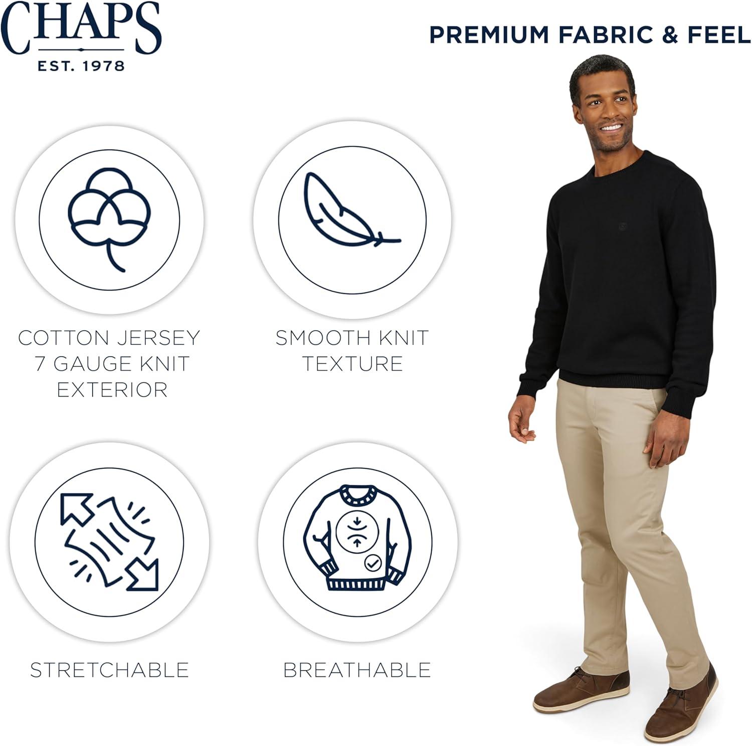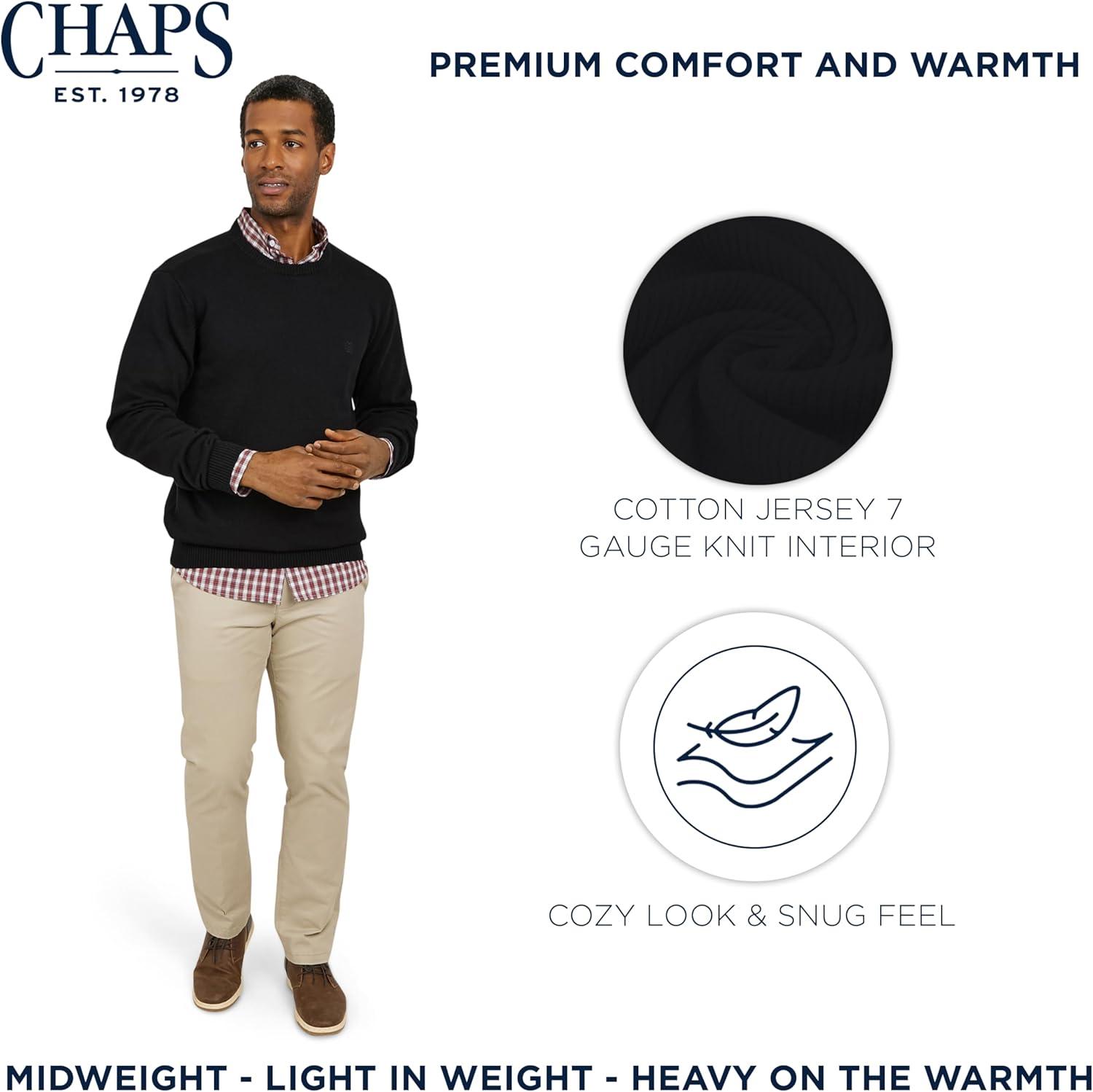 A true wardrobe classic, this Chaps crewneck sweater embodies the brand's timeless American aesthetic, a legacy that began in 1978. Designed to blend traditional style with modern, everyday comfort, its refined and clean look transitions effortlessly from the office to a weekend outing. With a curated selection of classic colors, this sweater is the perfect piece to showcase your personal style all season long. For a semi-formal event, pair it with dress pants and a blazer, or keep it casual with jeans or chinos for a relaxed feel. Experience the superior comfort and warmth of our mid-weight 100% cotton jersey. This soft, 7-gauge fabric provides exceptional warmth with a comfortable, non-bulky feel, making it the perfect layering piece. Its single-knit construction offers a smooth, knit texture and a stretchy design for unrestricted movement, while the classic ribbed cuffs, hem, and collar provide a snug fit that locks in warmth. This cozy sweater is also machine washable for convenient, low-maintenance care, so it's always ready to wear again in no time. This garment is designed for a timeless look and features a classic fit that is easy to wear and comfortable for every body type. A straight hem provides a clean, modern look that is perfect for wearing untucked, while a crest Chaps logo on the chest adds a signature detail. With its durable construction and lasting quality, this sweater is a versatile and reliable addition to any wardrobe.