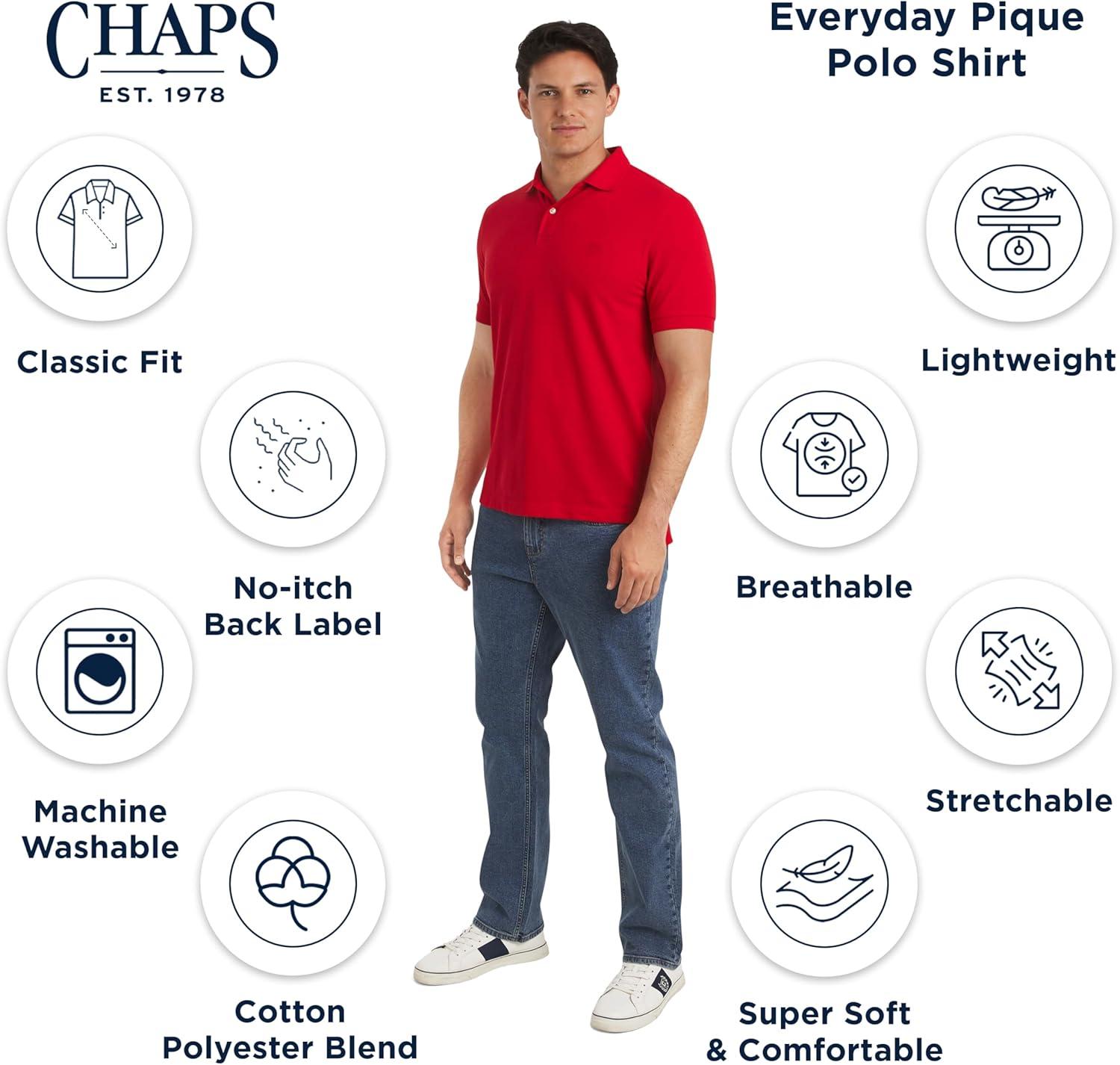 The Chaps legacy, born in 1978, has always been about celebrating a timeless American aesthetic. This stretch pique polo embodies our spirited tradition, blending classic, versatile style with modern, everyday comfort. Its structured yet comfortable fabric provides a crisp, refined look, making it the perfect wardrobe essential that effortlessly transitions from business and formal settings to your everyday wear and most relaxed weekends. A range of sharp designs and vibrant colors ensures you'll find the ideal polo to elevate your style for any occasion. Experience premium comfort with our super soft, lightweight, and breathable pique fabric. The cotton-polyester blend offers a perfect balance of durability, flexibility, and feel, complete with moisture-wicking properties to keep you cool and dry throughout the day. This classic shirt features a distinct textured knit for added style, while the two-button placket and side vents provide a comfortable and classic fit. Thoughtful design details complete this polo, from the ribbed collar and cuffs that give it a traditional feel to the clean, straight hem that looks great tucked or untucked. An embroidered crest logo on the chest adds a final touch of signature style, and the no-itch back label ensures all-day comfort. To make care easy, this polo is machine washable for convenient, low-maintenance cleaning, allowing it to look its best and be ready to wear in no time.