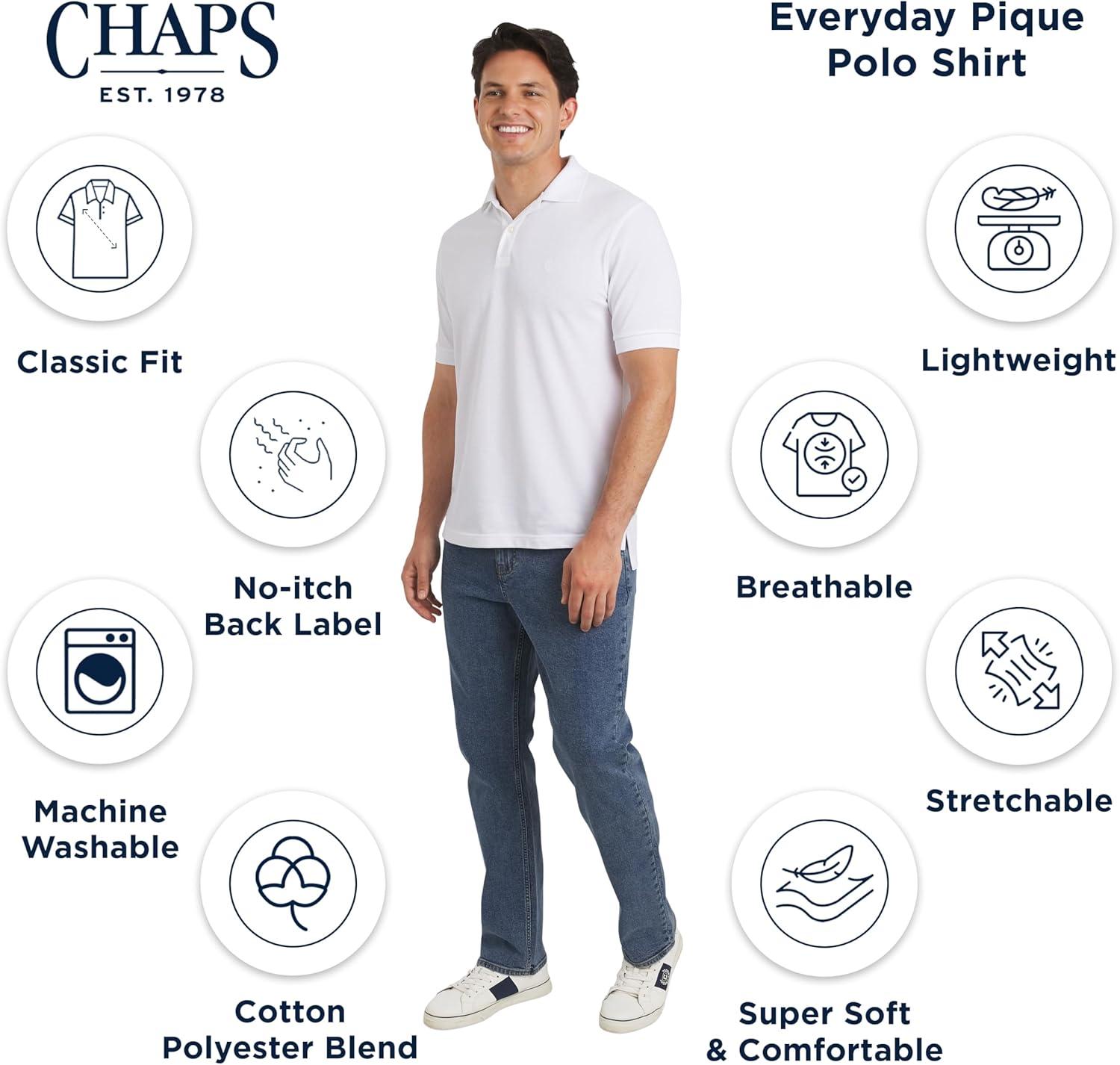 The Chaps legacy, born in 1978, has always been about celebrating a timeless American aesthetic. This stretch pique polo embodies our spirited tradition, blending classic, versatile style with modern, everyday comfort. Its structured yet comfortable fabric provides a crisp, refined look, making it the perfect wardrobe essential that effortlessly transitions from business and formal settings to your everyday wear and most relaxed weekends. A range of sharp designs and vibrant colors ensures you'll find the ideal polo to elevate your style for any occasion. Experience premium comfort with our super soft, lightweight, and breathable pique fabric. The cotton-polyester blend offers a perfect balance of durability, flexibility, and feel, complete with moisture-wicking properties to keep you cool and dry throughout the day. This classic shirt features a distinct textured knit for added style, while the two-button placket and side vents provide a comfortable and classic fit. Thoughtful design details complete this polo, from the ribbed collar and cuffs that give it a traditional feel to the clean, straight hem that looks great tucked or untucked. An embroidered crest logo on the chest adds a final touch of signature style, and the no-itch back label ensures all-day comfort. To make care easy, this polo is machine washable for convenient, low-maintenance cleaning, allowing it to look its best and be ready to wear in no time.