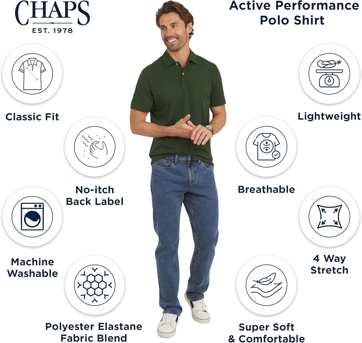 The Chaps legacy, born in 1978, has always been about celebrating a timeless American aesthetic. This stretch performance polo embodies our spirited tradition, blending a classic fit with modern functionality. It's the ultimate wardrobe essential, designed to effortlessly transition from your athletic and outdoor activities—such as golf, tennis, and hiking—to your casual and everyday wear. The sleek, comfortable fabric and a range of sharp designs ensure it's the perfect polo to elevate your style for any occasion. Experience premium comfort with our super soft, lightweight, and breathable fabric. The 4-way stretch polyester and elastane blend provides the perfect balance of durability and flexibility, with moisture-wicking properties to keep you cool and dry all day. This classic shirt features a smooth, sleek feel for a modern, athletic look, while the two-button placket and side vents ensure a comfortable fit that moves with you. Thoughtful design details complete this polo, from the straight hem that provides a clean, modern look for wearing untucked, to the convenient locker loop at the back neck for easy hanging and storage. The no-itch back label ensures all-day comfort. To make care easy, this polo is machine washable for convenient, low-maintenance cleaning, allowing it to look its best and be ready to wear in no time.