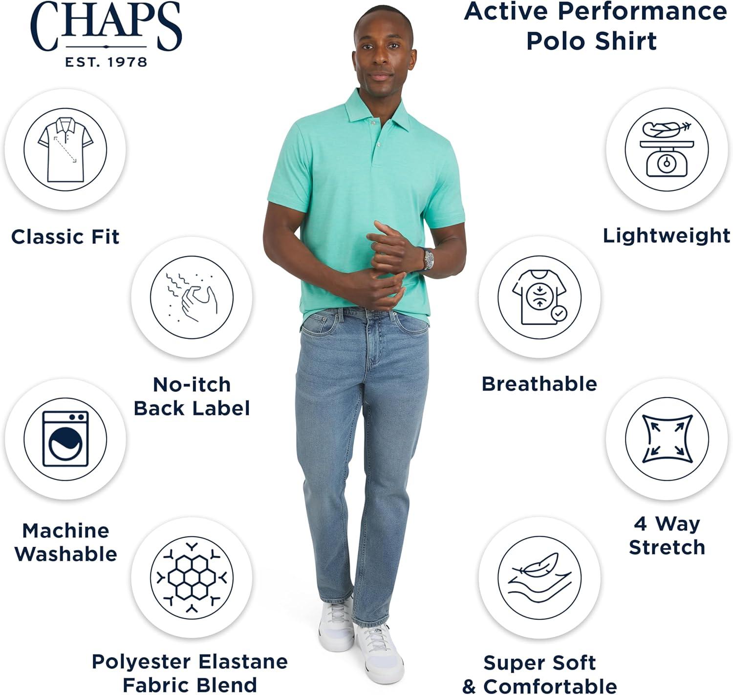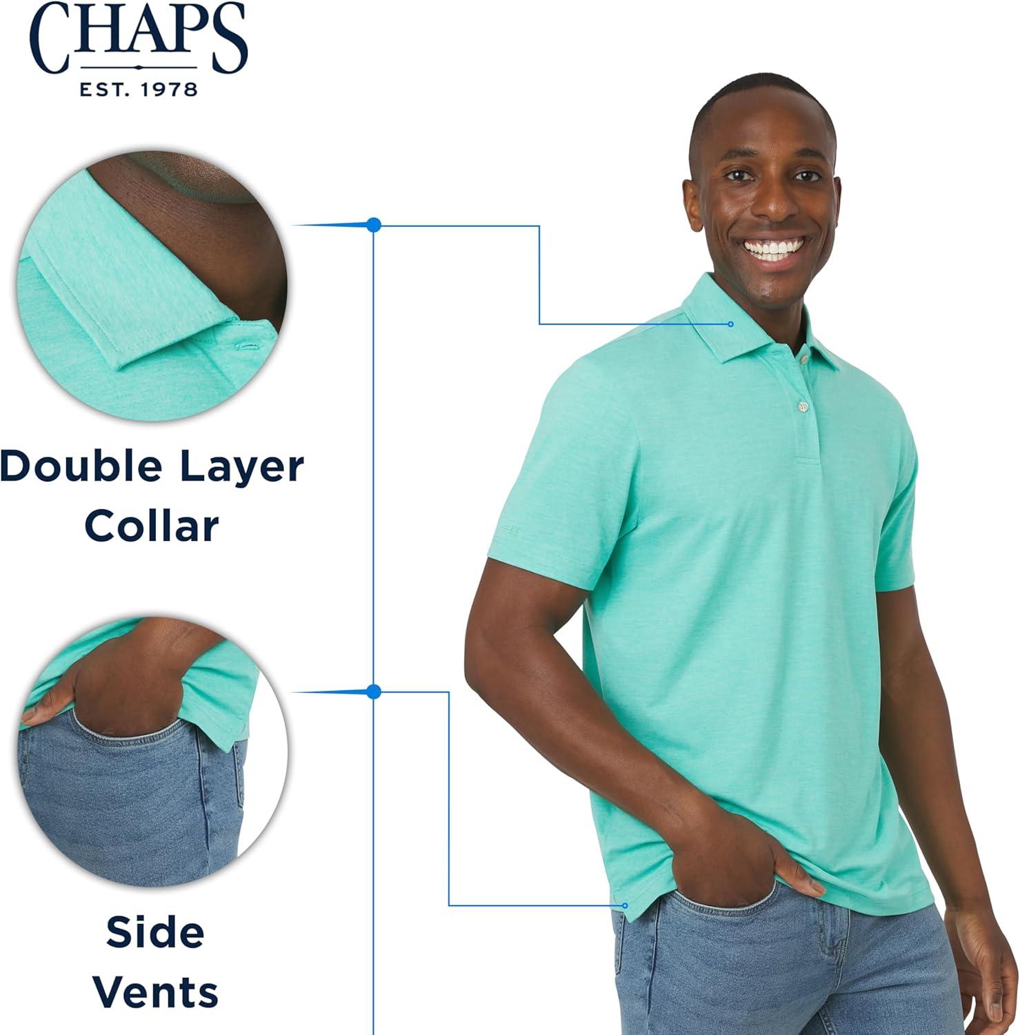 The Chaps legacy, born in 1978, has always been about celebrating a timeless American aesthetic. This stretch performance polo embodies our spirited tradition, blending a classic fit with modern functionality. It's the ultimate wardrobe essential, designed to effortlessly transition from your athletic and outdoor activities—such as golf, tennis, and hiking—to your casual and everyday wear. The sleek, comfortable fabric and a range of sharp designs ensure it's the perfect polo to elevate your style for any occasion. Experience premium comfort with our super soft, lightweight, and breathable fabric. The 4-way stretch polyester and elastane blend provides the perfect balance of durability and flexibility, with moisture-wicking properties to keep you cool and dry all day. This classic shirt features a smooth, sleek feel for a modern, athletic look, while the two-button placket and side vents ensure a comfortable fit that moves with you. Thoughtful design details complete this polo, from the straight hem that provides a clean, modern look for wearing untucked, to the convenient locker loop at the back neck for easy hanging and storage. The no-itch back label ensures all-day comfort. To make care easy, this polo is machine washable for convenient, low-maintenance cleaning, allowing it to look its best and be ready to wear in no time.