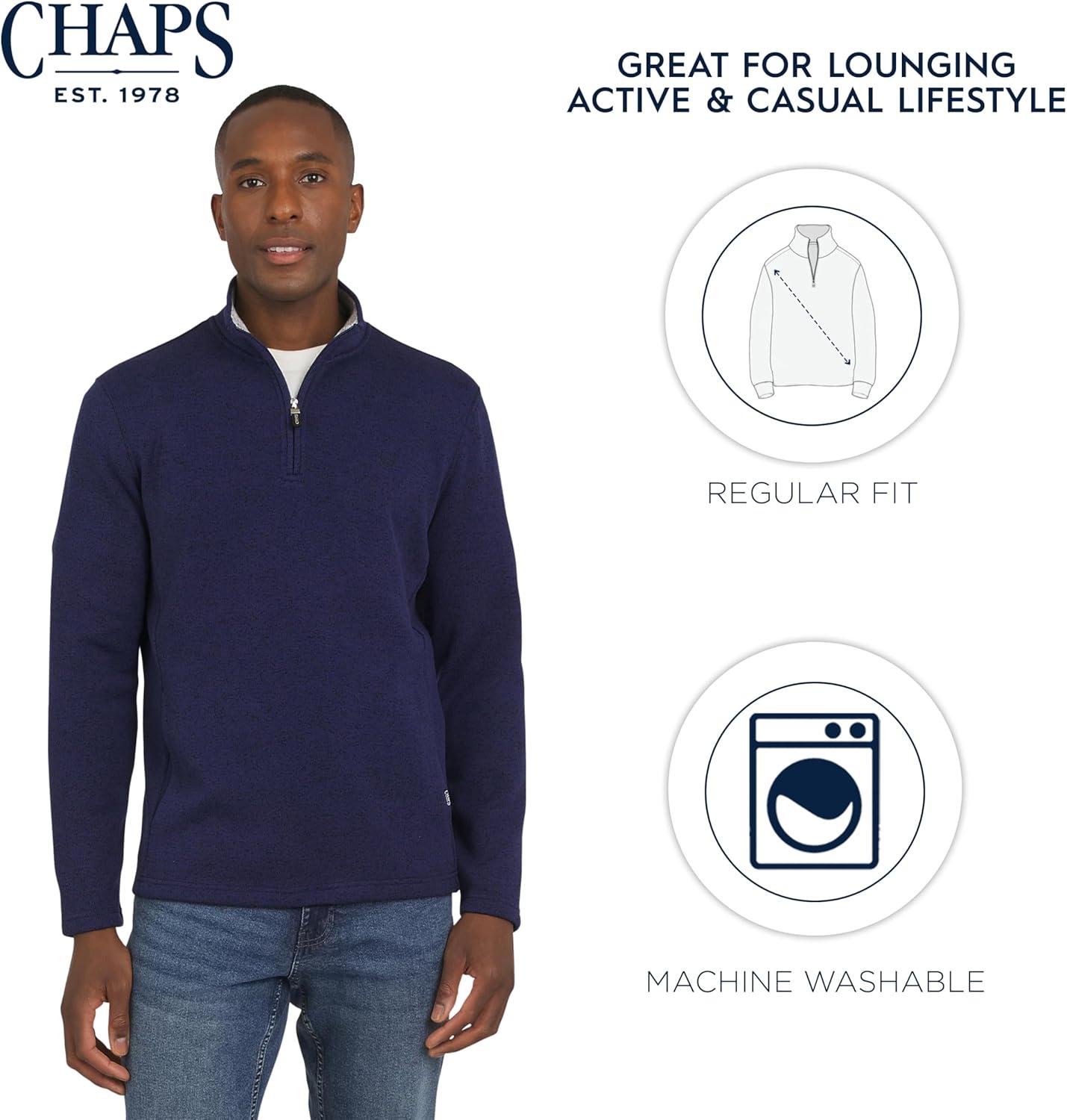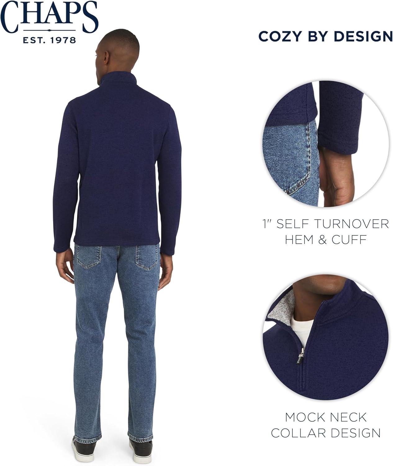 Embodying the timeless American aesthetic that began in 1978, the Chaps brand delivers classic and versatile pieces that seamlessly blend traditional style with modern, everyday comfort. This essential sweater is a perfect example, designed to elevate your wardrobe with a refined, clean look that transitions effortlessly from the office to outdoors. Its curated selection of classic colors and easy-to-style nature make it the ideal piece to showcase your personal style, whether you're dressing it up with a blazer and dress pants for a semi-formal event or keeping it casual with jeans for a weekend outing. Experience premium comfort and warmth with this mid-weight fleece sweater, meticulously crafted to provide exceptional warmth without the bulky feel. The outside features a smooth knit texture for a sleek, clean look, while the inside has plush, brushed fleece that feels incredibly soft against your skin. The stretchy fabric is designed to move with you and ensure a snug fit that locks in warmth, making this the perfect layering piece for any season. The versatile mock neck collar can be zipped up for added warmth or worn down for a relaxed, polo-like look. Designed for a timeless look, this garment features a comfortable, regular fit available in sizes from Small through XX-Large to ensure a great fit. A straight hem provides a clean, modern look that's perfect for wearing untucked, while a crest Chaps logo on the chest adds a touch of classic style. Two convenient side seam pockets offer discreet storage. To make maintenance simple, this cozy sweater is machine washable for convenient, low-maintenance care, ensuring it’s easy to keep looking its best and ready to wear again in no time.
